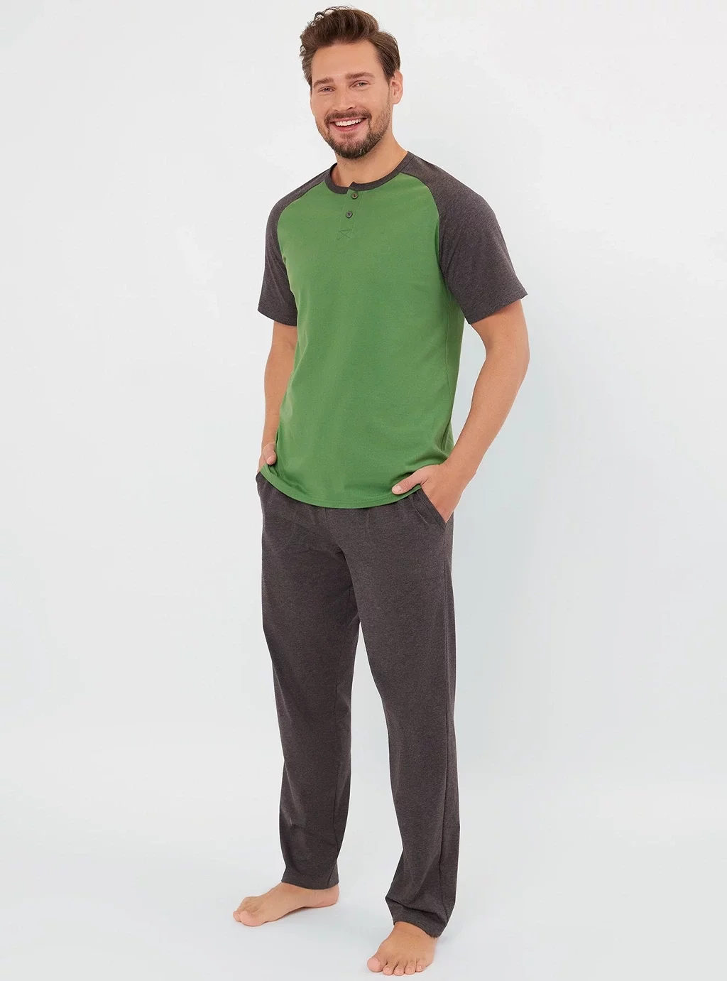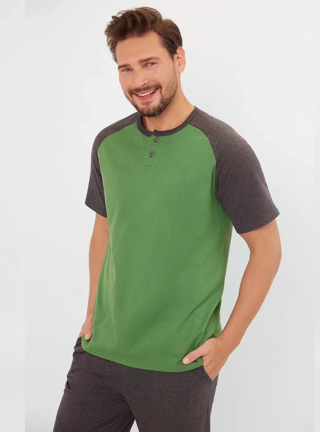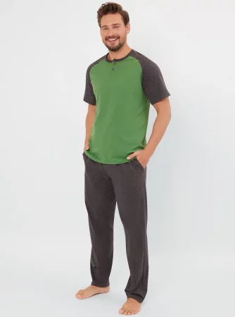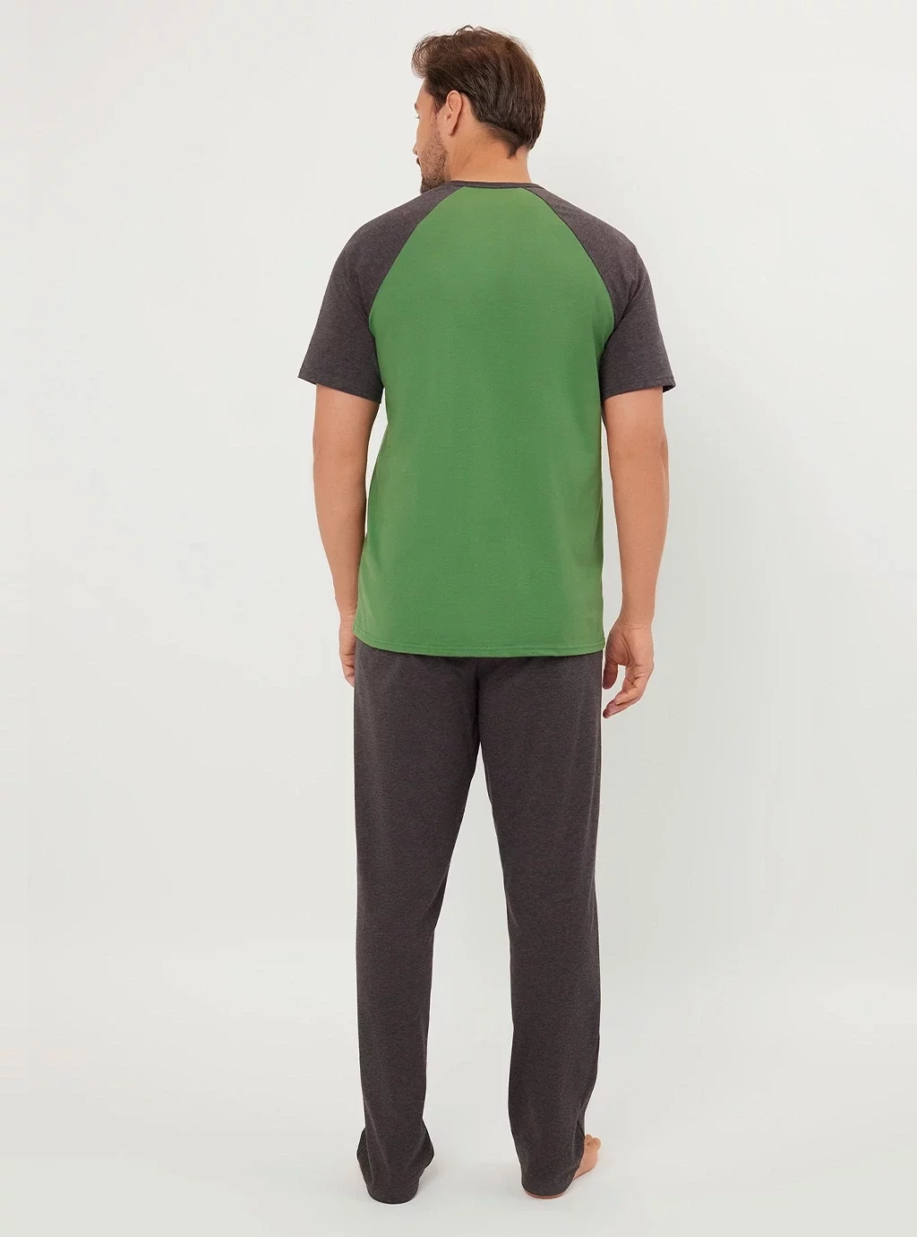 Prezentowana męska piżama o klasycznym fasonie to doskonała opcja zarówno na wieczorny relaks, jak i poranny odpoczynek. Górna część piżamy to dwukolorowa koszulka z raglanowymi rękawami i okrągłym dekoltem, która łączy komfort z elegancją dzięki zapięciu na guziki typu polo. Dół to gładkie spodnie, które zapewniają wygodę i swobodę ruchów, wyposażone w funkcjonalne kieszenie po bokach. Całość wykonana z naturalnej, miękkiej bawełny, która jest przyjemna dla skóry, zapewniając komfort i ciepło przez całą noc. To piżama, która łączy prostotę z praktycznością.