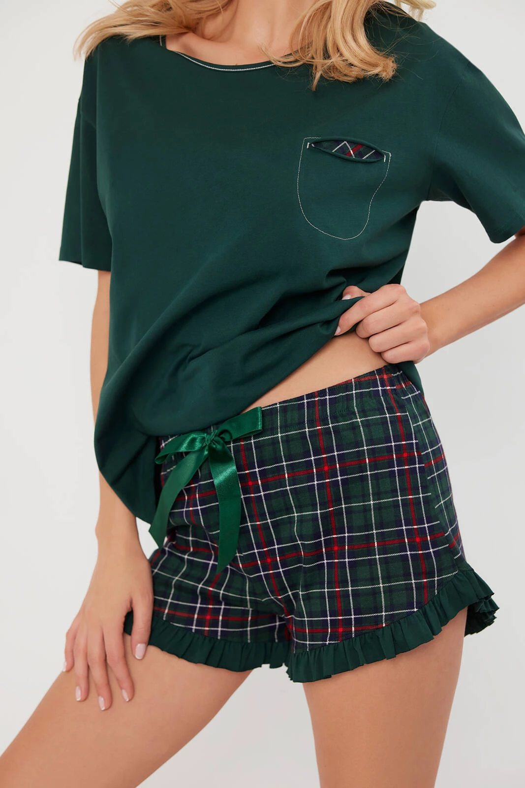 Ta piżama damska to prawdziwa esencja stylu, łącząca elegancję z wygodą. Bluzka posiada pudełkowy fason, który pięknie układa się na sylwetce, zapewniając komfort i swobodę ruchów, a jej jednolity kolor dodaje całości subtelnej prostoty. Na wysokości piersi znajduje się mała kieszonka, ozdobiona detalem w kratę i subtelną białą nitką, co dodaje piżamie unikalnego charakteru. Okrągły dekolt, również wykończony białą nitką, stanowi delikatny akcent, który podkreśla elegancję całości. Dolna część piżamy to krótkie spodenki, które również mają klasyczny nadruk w kratę. Ich wyjątkowym wykończeniem jest dekoracyjna falbanka oraz duża atłasowa kokardka, która nadaje im dziewczęcego uroku i sprawia, że całość prezentuje się lekko i kobieco. Wykonana z 100% bawełny, piżama jest miękka, przyjemna w dotyku i zapewnia komfort podczas snu.