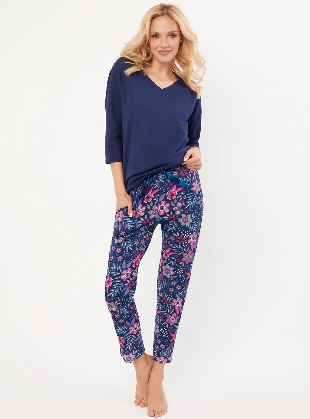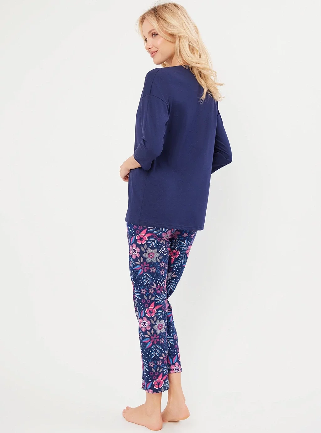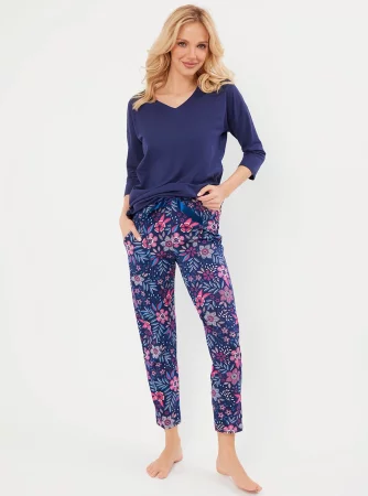 Nasza piżama damska z 100% bawełny to połączenie klasyki, wygody i elegancji, które sprawiają, że jest to idealny wybór nie tylko na noc, ale także na poranne i wieczorne leniuchowanie. Prostota fasonu zapewnia komfort, a jednocześnie prezentuje się stylowo, sprawdzając się zarówno w codziennym użytkowaniu, jak i podczas relaksu w domu. Górna część piżamy posiada rękawy o długości ¾, które są idealne na cieplejsze dni, a dekolt w serek dodaje całości subtelnej elegancji. Jednolity kolor góry sprawia, że cała piżama ma stonowany, ale niezwykle stylowy wygląd. Dolna część piżamy składa się ze spodni 7/8, które wyróżniają się pięknym florystycznym printem, wprowadzając do całości odrobinę romantyzmu i świeżości. Dodatkowo, spodenki zostały ozdobione atłasową kokardką, która stanowi delikatny akcent, podkreślający kobiecość i elegancję.