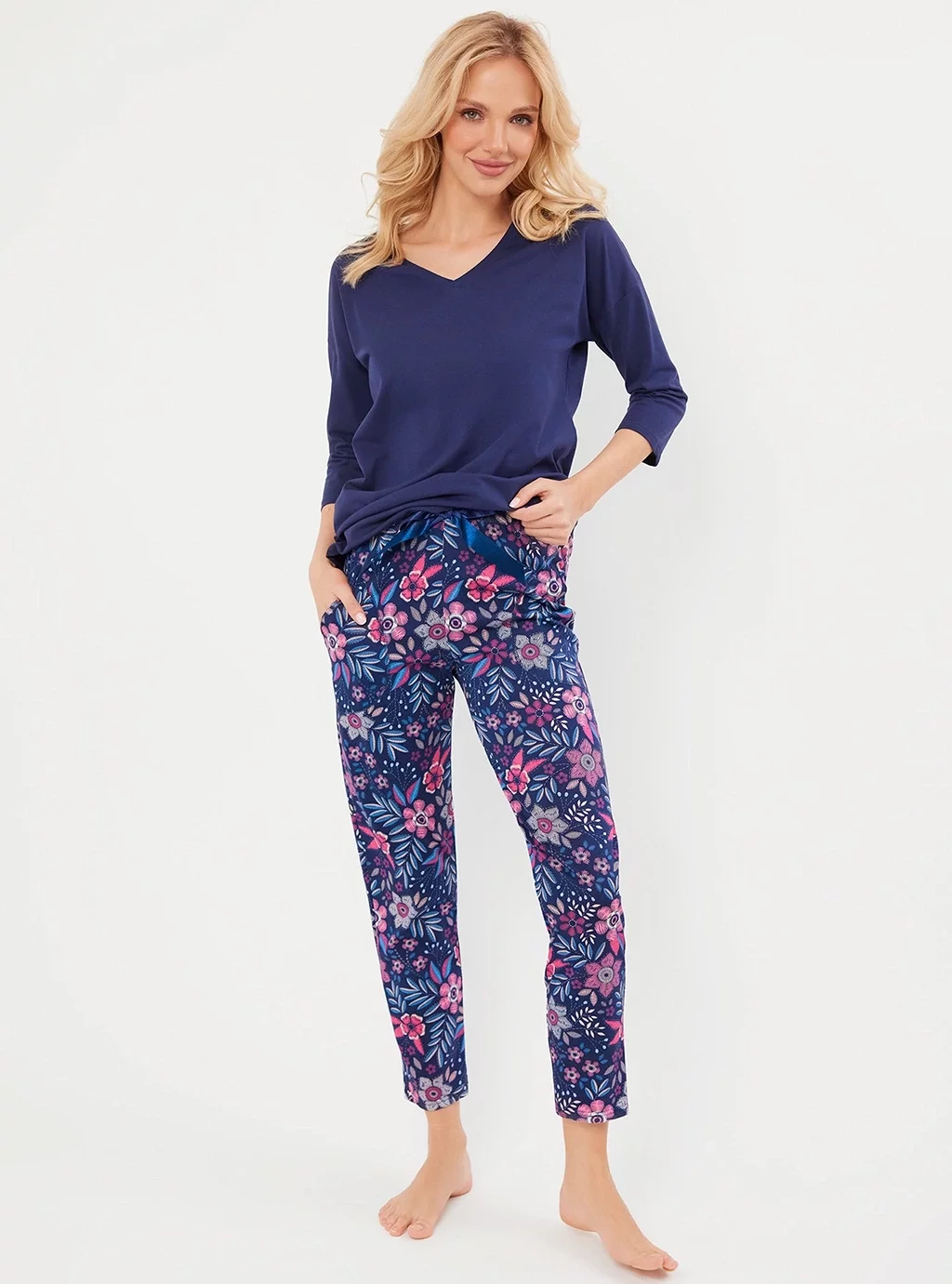 Piżama o prostej linii. W bluzie dekolt w serek. Spodnie z kieszeniami i ozdobną atłasową kokardą w talii w kolorze bluzy.