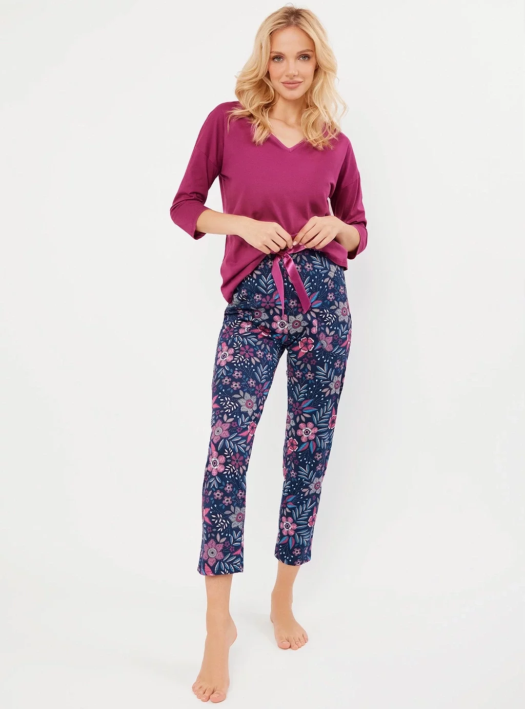 Nasza piżama damska z 100% bawełny to połączenie klasyki, wygody i elegancji, które sprawiają, że jest to idealny wybór nie tylko na noc, ale także na poranne i wieczorne leniuchowanie. Prostota fasonu zapewnia komfort, a jednocześnie prezentuje się stylowo, sprawdzając się zarówno w codziennym użytkowaniu, jak i podczas relaksu w domu. Górna część piżamy posiada rękawy o długości ¾, które są idealne na cieplejsze dni, a dekolt w serek dodaje całości subtelnej elegancji. Jednolity kolor góry sprawia, że cała piżama ma stonowany, ale niezwykle stylowy wygląd. Dolna część piżamy składa się ze spodni 7/8, które wyróżniają się pięknym florystycznym printem, wprowadzając do całości odrobinę romantyzmu i świeżości. Dodatkowo, spodenki zostały ozdobione atłasową kokardką, która stanowi delikatny akcent, podkreślający kobiecość i elegancję.