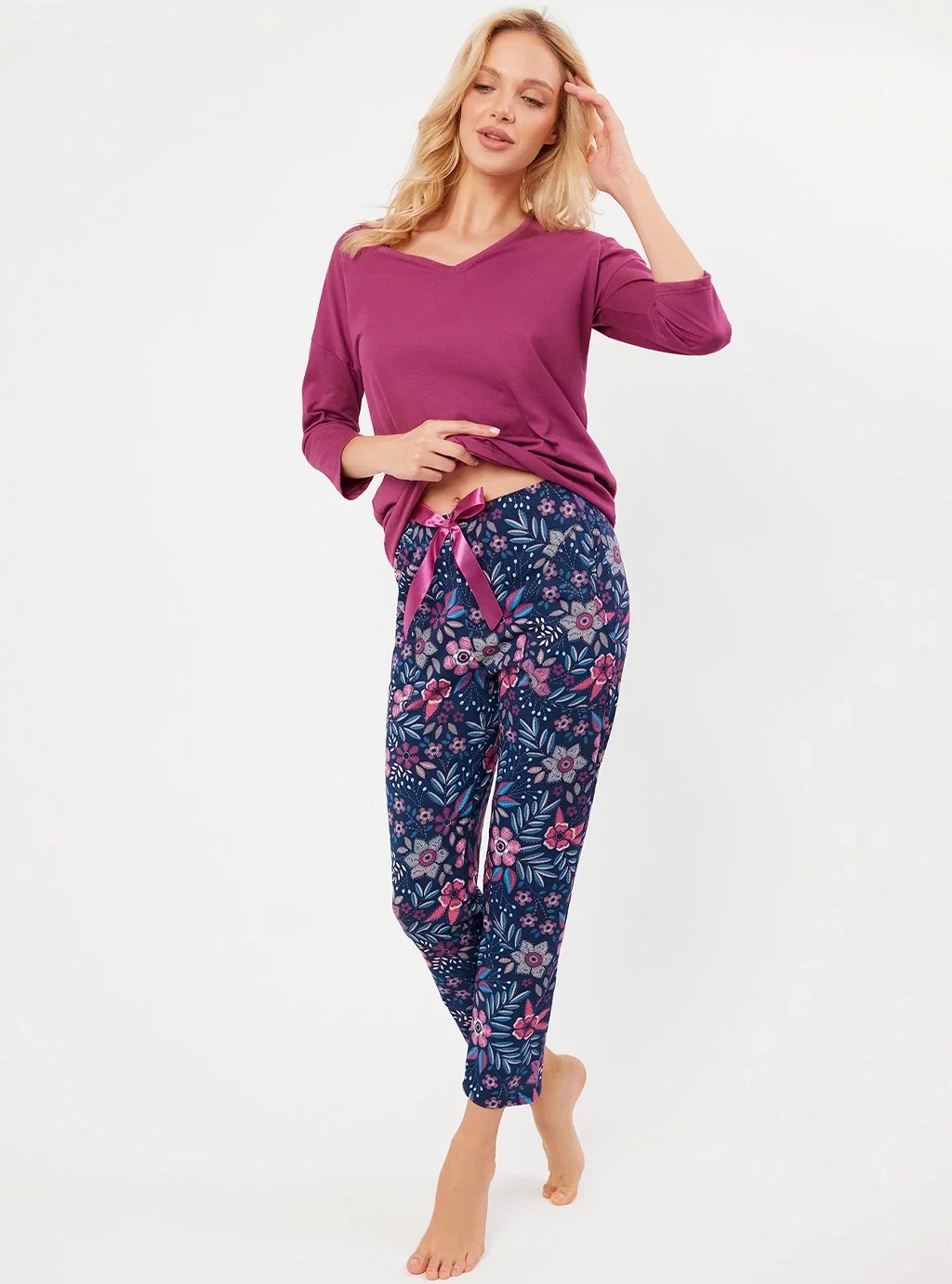 Piżama o prostej linii. W bluzie dekolt w serek. Spodnie z kieszeniami i ozdobną atłasową kokardą w talii w kolorze bluzy.