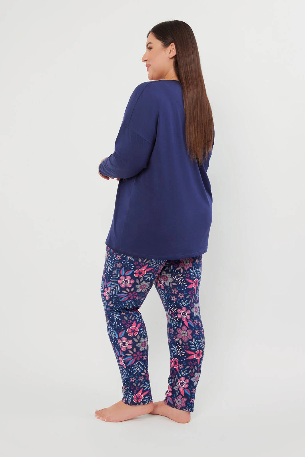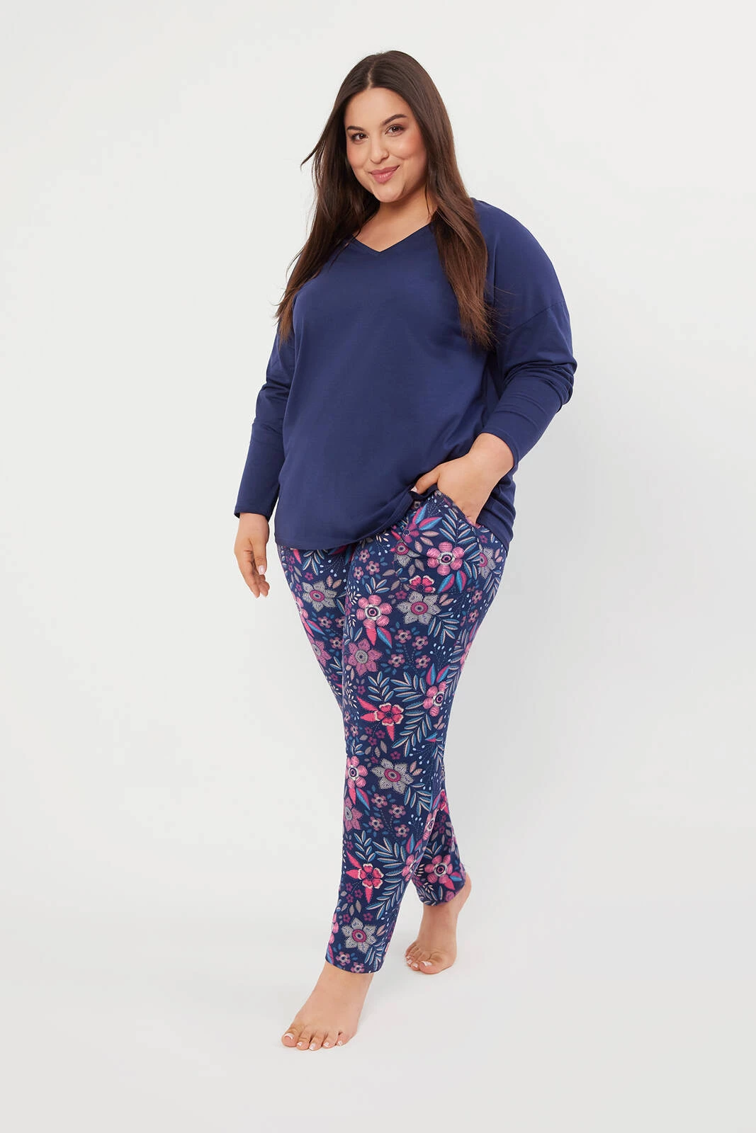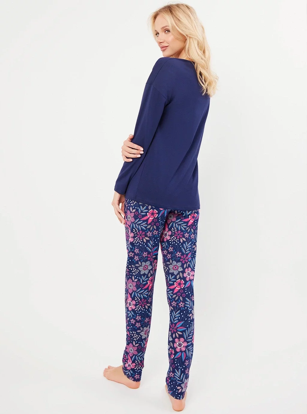 Ta piżama damska z bawełny to doskonały wybór dla kobiet, które stawiają na komfort, ale nie rezygnują z modnego wyglądu. Ten elegancki komplet składa się z bluzki z długim rękawem, utrzymanej w jednolitym kolorze, co nadaje jej klasycznego charakteru. Dekolt w serek dodaje całości subtelnej elegancji, sprawiając, że piżama jest zarówno wygodna, jak i stylowa. Długie spodnie dopełniają całość, a ich efektowny nadruk w kwiaty i liście wprowadza do stylizacji nutę świeżości i romantyzmu. Dodatkowo, umieszczona na nich atłasowa kokardka stanowi elegancki akcent, który podkreśla kobiecość i dodaje uroku.
