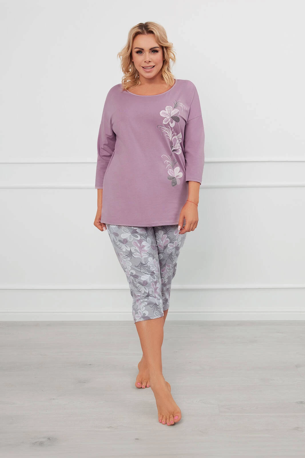 Delikatna i pełna uroku piżama damska to idealny wybór dla kobiet, które cenią subtelną elegancję i komfort. Bluzka z rękawem 3/4 utrzymana w jednolitym kolorze, wyróżnia się okrągłym dekoltem, który dodaje jej klasycznego, kobiecego charakteru. Subtelny print zdobiący bluzkę wprowadza do całości nutę lekkości i świeżości, zachowując przy tym elegancki wygląd. Dolna część piżamy to spodnie 3/4, które zostały udekorowane pięknym roślinnym motywem, dodającym całości naturalnego uroku. Dzięki połączeniu tych detali, piżama staje się pełna wdzięku, idealna do relaksu w domowym zaciszu. Całość została wykonana z miękkiego, bawełnianego dżerseju, co zapewnia wygodę przez całą noc, a jednocześnie sprawia, że piżama jest przyjemna w dotyku i łatwa w pielęgnacji. To doskonały wybór dla kobiet szukających połączenia subtelnej elegancji z komfortem.