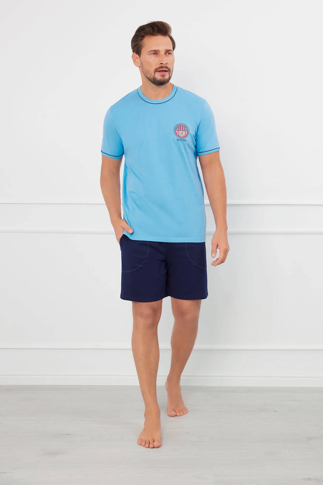 Krótka piżama męska charakteryzuje się wygodnym fasonem, idealnym na ciepłe noce. Koszulka z krótkim rękawem posiada na piersi nadruk wykonany techniką sitodruku, co zapewnia jego trwałość i wyrazistość. Dodatkowo, kontrastowe obszycia na lamówce oraz na brzegach rękawków nadają całości modnego charakteru. Zestaw uzupełniają krótkie spodenki, które mają lekko zaznaczone kieszenie, łącząc funkcjonalność z estetyką. Całość wykonana jest z miękkiej bawełny, która jest przyjemna dla ciała, zapewniając komfort podczas snu.