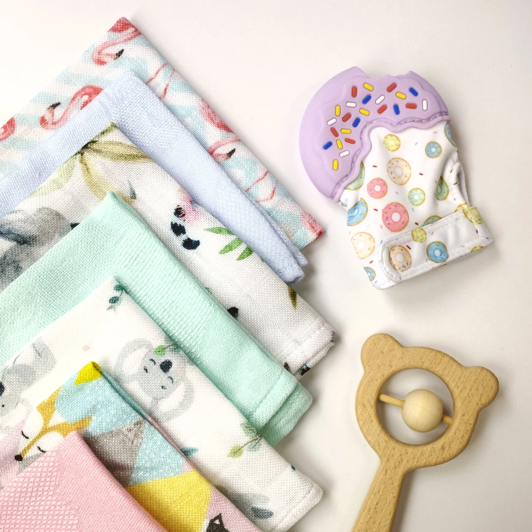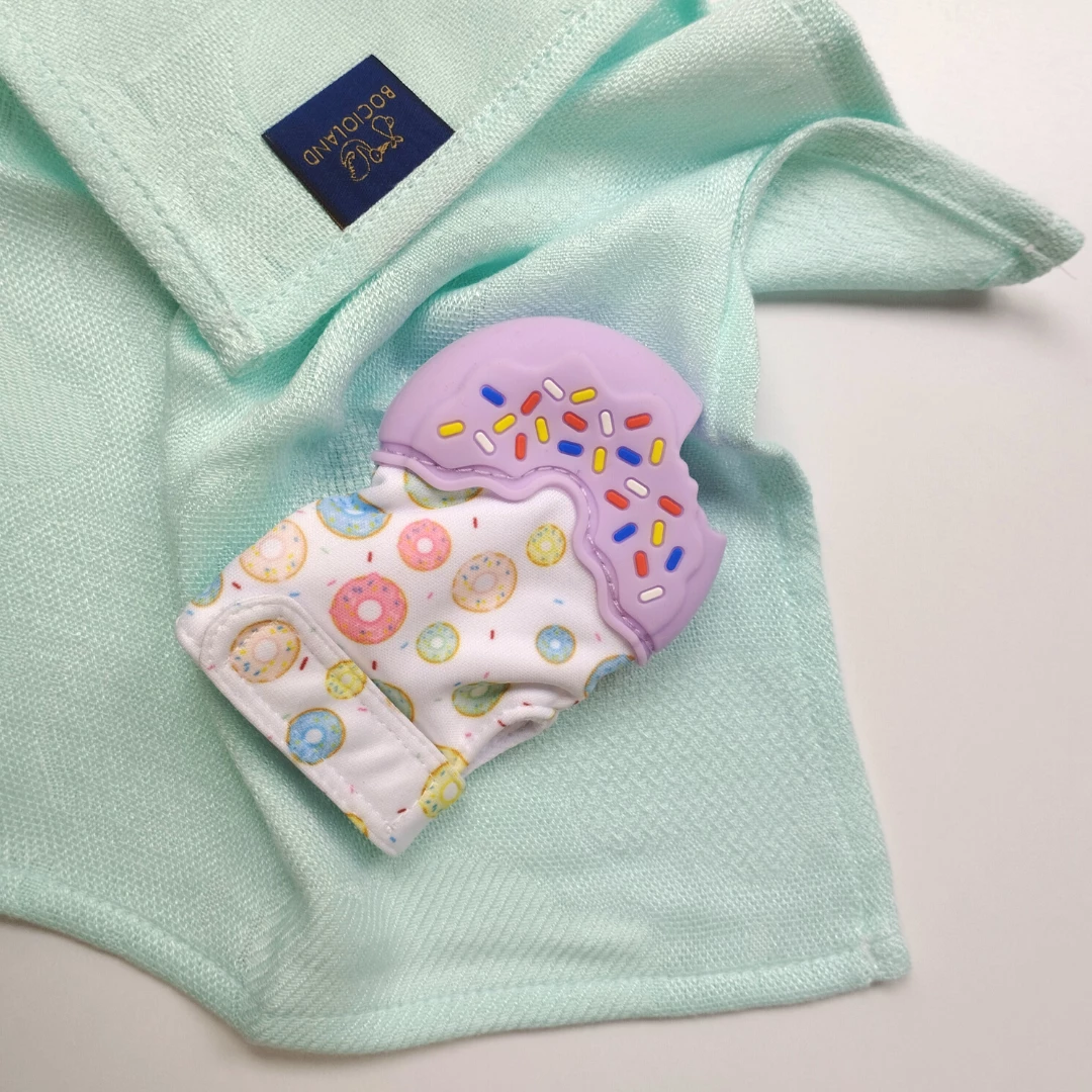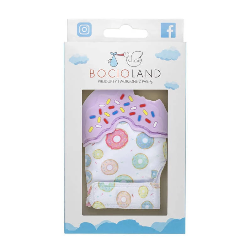 Rękawica wykonana z miękkiego, elastycznego silikonu, który dopasowuje się do dziąseł malucha oraz szeleszczącego materiału.