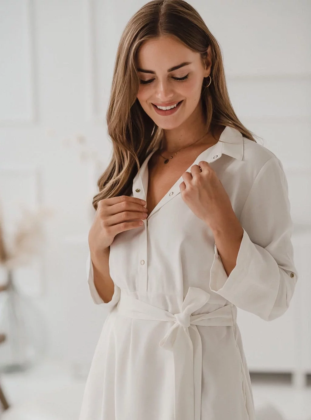 Wybierz rozmiar, który nosisz na co dzień – szmizjerka dopasuje się do zmieniającej się sylwetki i będzie towarzyszyć Ci na każdym etapie macierzyństwa.
