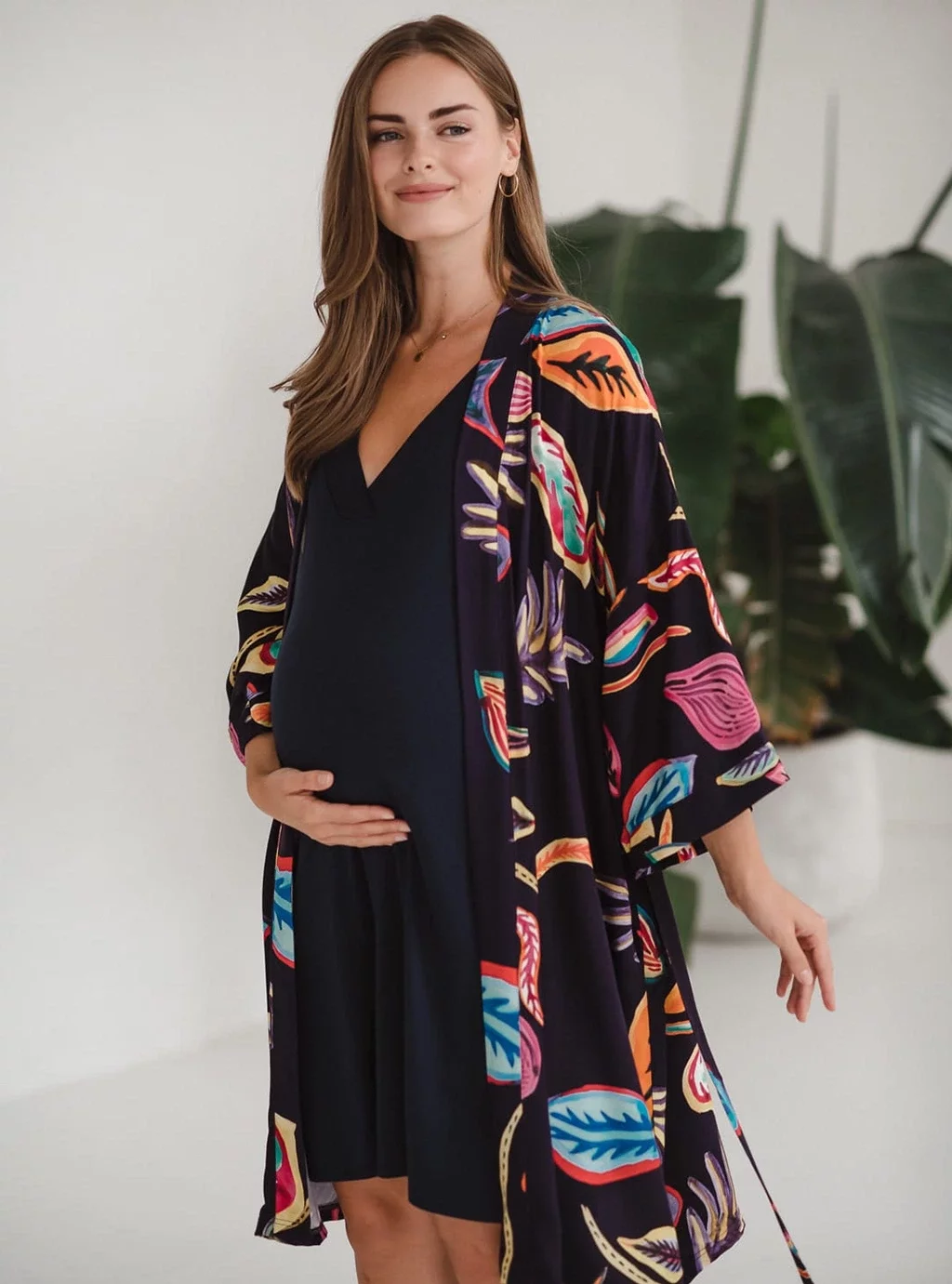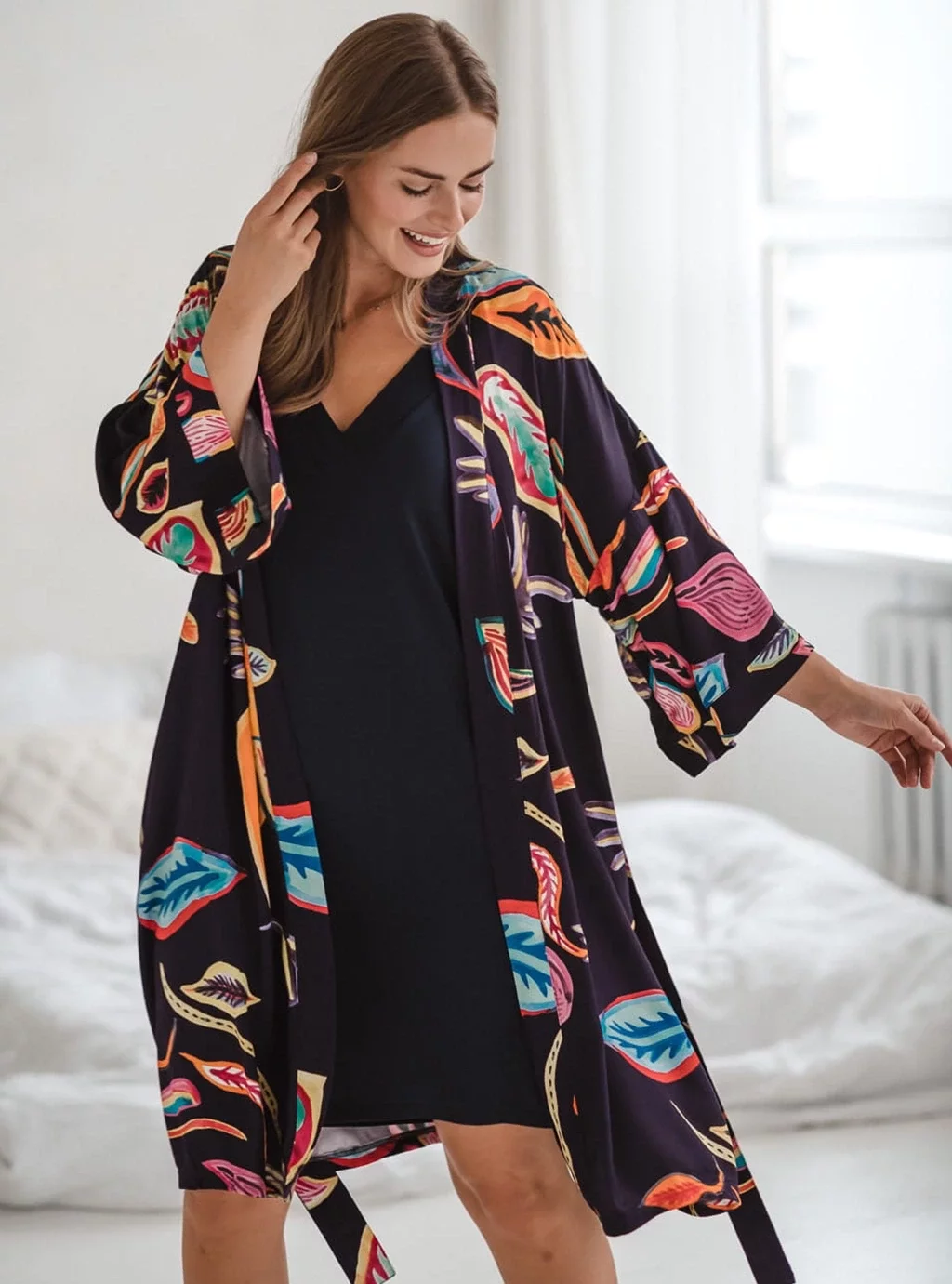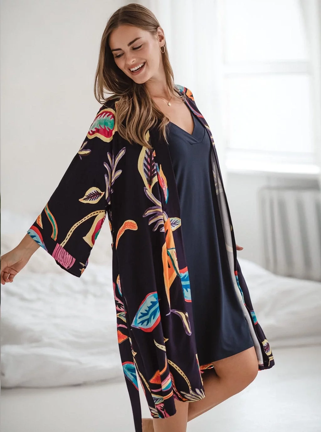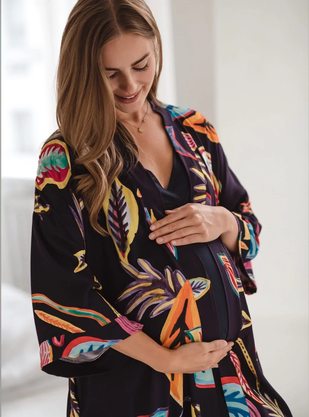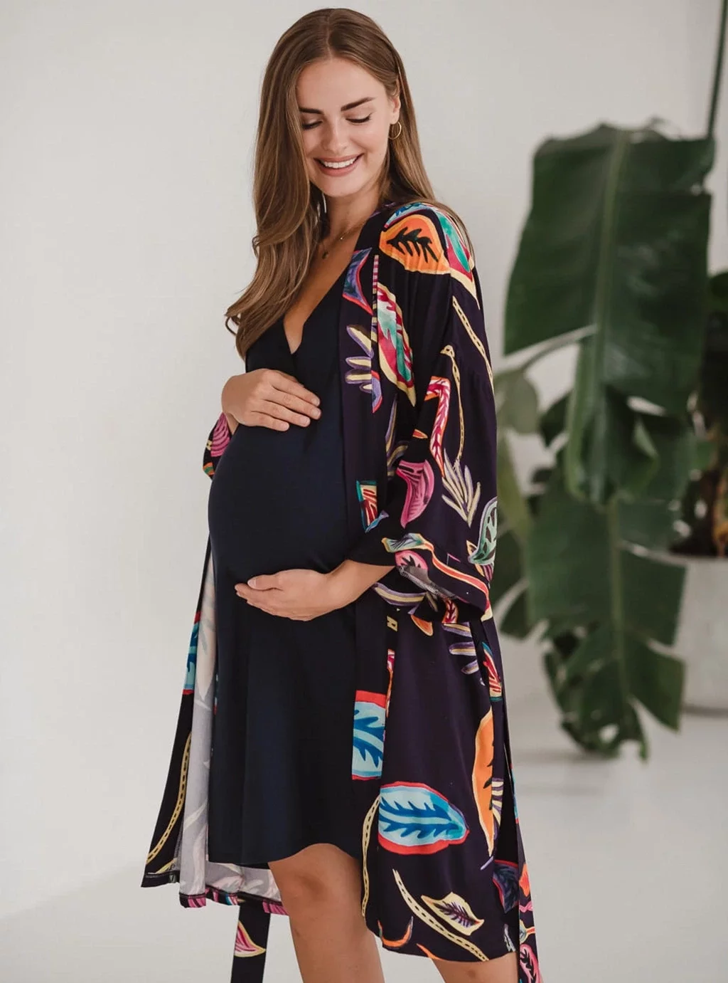 Ten wyjątkowy szlafrok z bambusa to doskonały wybór dla każdej mamy, której zależy na połączeniu wygody i elegancji. Wykonany z niezwykle miękkiej i oddychającej tkaniny bambusowej, szlafrok otula ciało delikatnością, idealnie sprawdzając się zarówno w okresie ciąży, jak i po porodzie. Jego krój kimono pozwala na swobodne dopasowanie się do sylwetki, a kobiecy print ożywia, dodając energii i pięknie podkreślając kobiecość.