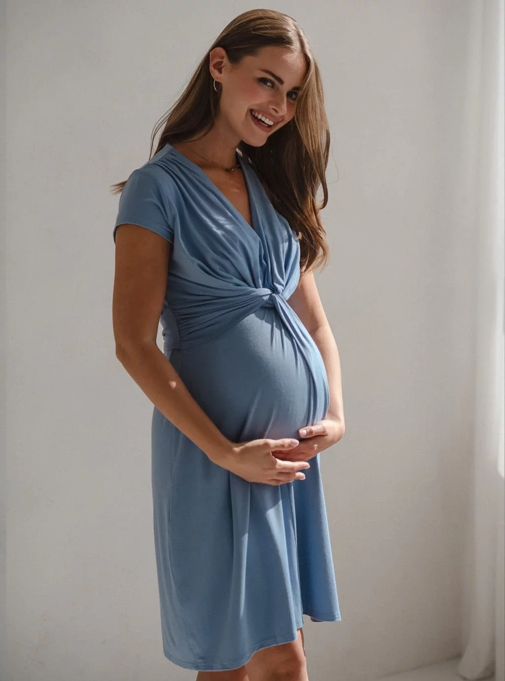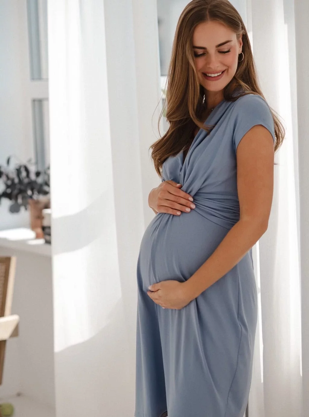 Sukienka ciążowa i do karmienia łączy w sobie funkcjonalność z elegancją i komfortem. Stworzona z elastycznej wiskozy z domieszką elastanu, jest przyjemna w dotyku i zapewnia wygodę noszenia na każdym etapie ciąży, a także po porodzie. Sukienka posiada wszyty pasek, który można regulować z tyłu, co pozwala na idealne dopasowanie do zmieniającej się sylwetki. Dzięki przemyślanemu dekoltowi z ozdobnym węzłem, możliwe jest dyskretne karmienie piersią, wystarczy delikatnie odchylić materiał, co zapewnia wygodę dla mamy i maleństwa.
