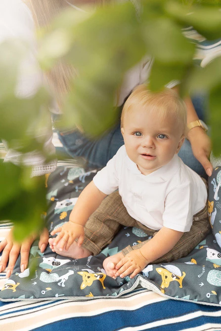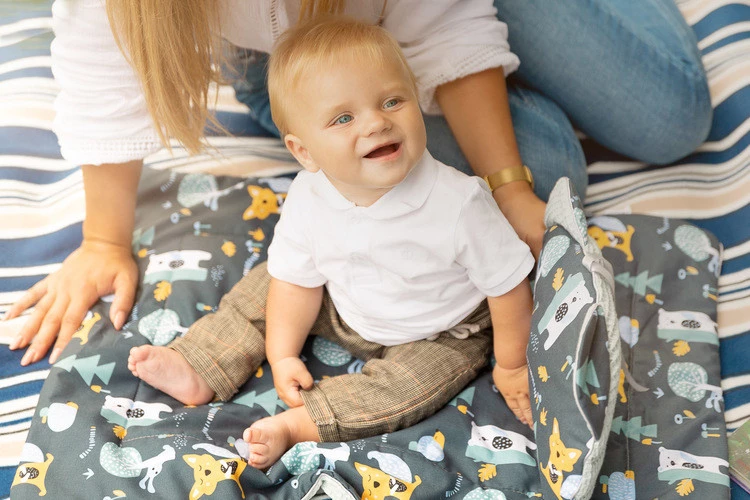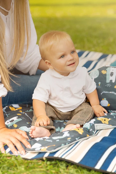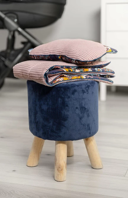 Komplet do wózka Wafel składa się z poduszki (36x28 cm) i kocyka (56x76 cm). Dzięki takim rozmiarom komplet idealnie sprawdza się w wózku, łóżeczku czy jako miękka mata dla Maluszka. W środku znajduje się antyalergiczne wypełnienie, które zapewnia odpowiednią izolację przed chłodem. Sama poduszka może służyć jako Przytulanka. Zestaw został wykonany ze 100% bawełny - z jednej strony znajduje się nadruk, a z drugiej miękka bawełna o strukturze wafla, która nadaje niepowtarzalny wygląd całemu zestawowi
