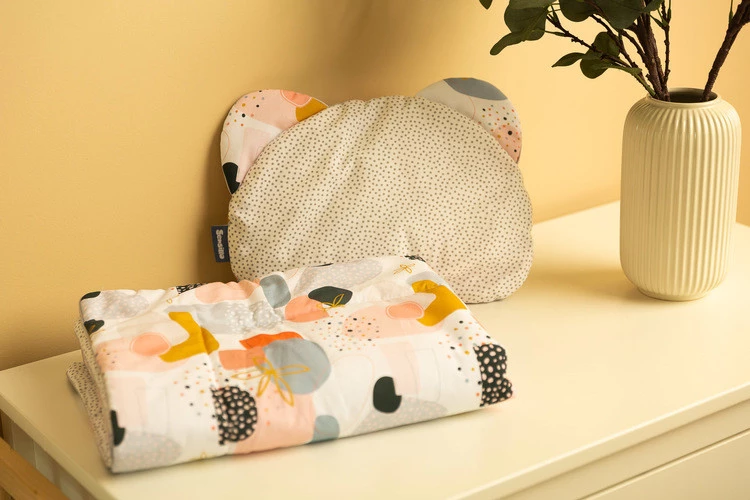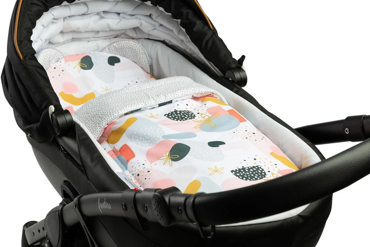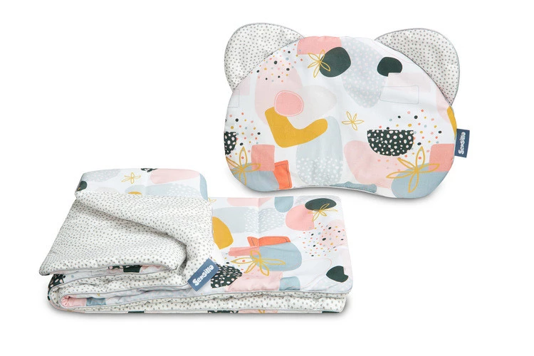 W skład kompletu do wózka wchodzi poduszka i kocyk z warstwą wypełnienia z włókniny silikonowej. Komplet idealnie sprawdza się w wózku, łóżeczku czy jako miękka mata dla maluszka. Sama poduszka może służyć jako przytulanka. Zestaw został wykonany z bawełny 100% z unikalnym wzorem.