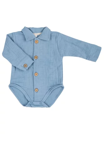 Niebieskie body niemowlęce dla chłopca o koszulowym kroju z delikatnym kołnierzykiem. Koszulobody niemowlęce posiada rozpięcie na rękawkach oraz drewniane guziczki na przodzie, gwarantujące łatwe ubieranie i rozbieranie maluszka. To wyjątkowe ubranko niemowlęce wykonane z miękkiej i przyjemnej w dotyku 100% bawełny muślinowej, zapewniającej komfort i swobodę ruchów. Antyalergiczne napki rozpinane w kroczku ułatwią zmianę pieluszki w każdej chwili.