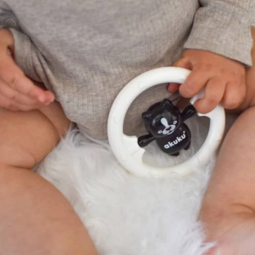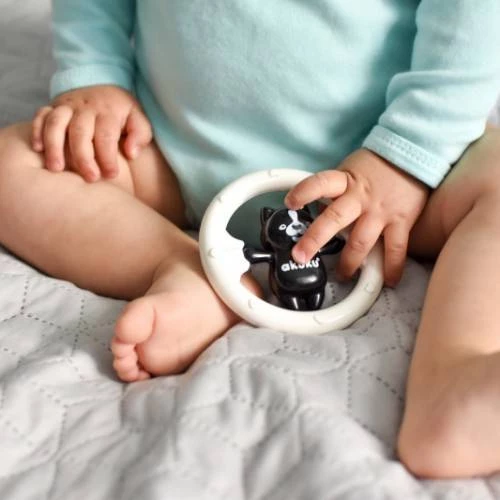 Grzechotka czarno-biała została zaprojektowana specjalnie dla najmłodszych dzieci. Wykonana z trwałych i bezpiecznych materiałów. Nie posiada ostrych krawędzi. Specjalnie dobrany kształt sprawia, że jest wygodna do uchwycenia i utrzymania w małych rączkach. Czarno - białe kolory stymulują zmysł wzroku u niemowlaka, który jeszcze nie rozróżnia barw. Rozwija koordynację wzrokowo-słuchową. Produkt całkowicie wolny od bisfenolu A (0% BPA).