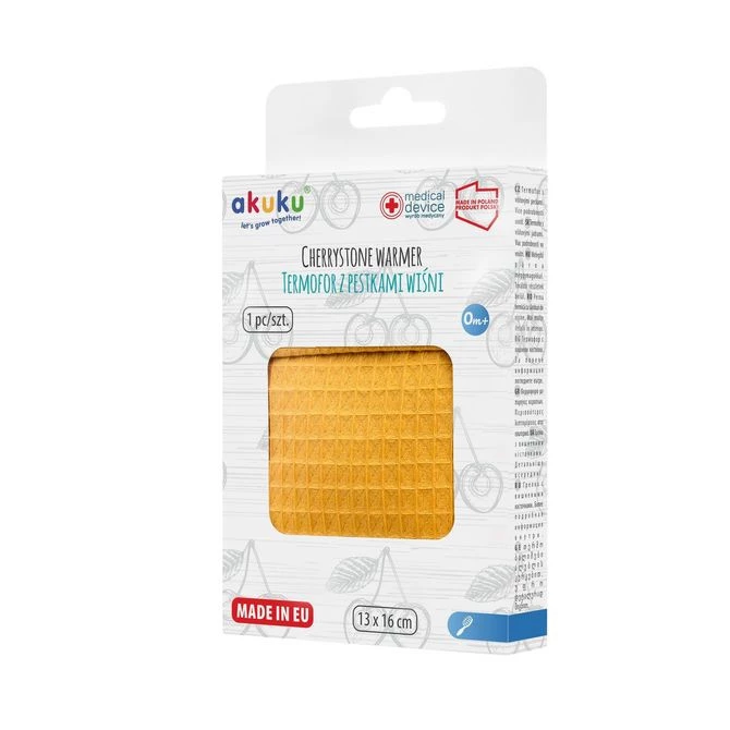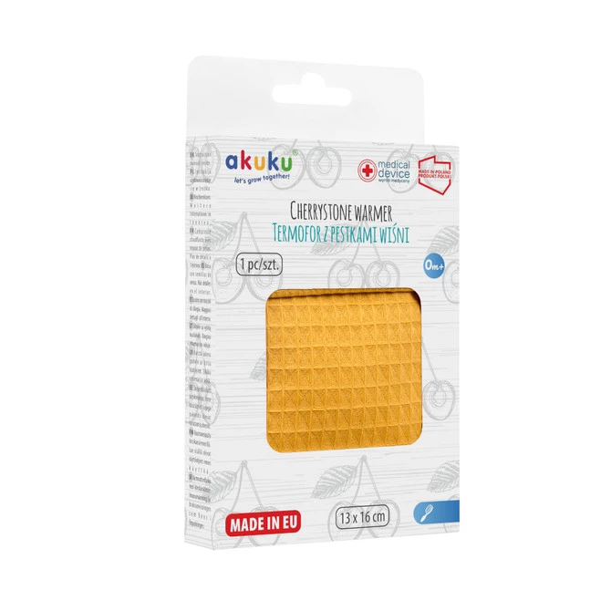 Termofor Wafel Premium od Akuku to elegancki i ekologiczny produkt z wkładem z pestek wiśni. Może być stosowany na ciepło i na zimno przynosząc dzieciom ulgę w wielu dolegliwościach. Specjalnie dobrany rozmiar (16×13 cm) pozwala na korzystanie z niego również przez mamy, np. rozgrzewając pierś podczas karmienia. Korzystanie z termoforu nie niesie za sobą ryzyka poparzeń, odmrożeń, zatrucia substancją wypełniającą, ani też wystąpienia alergicznych zmian skórnych. Wykonany jest z naturalnych surowców: pestki wiśni pochodzą z polskich upraw i są umieszczone w pokrowcu wykonanego z bawełny 100%.