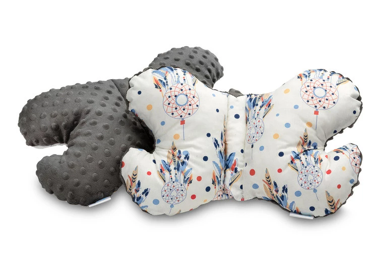 Poduszka Motylek zapewni bezpieczną i wygodną podróż maluszka. Jej specjalny kształt dopasowuje się do główki dziecka, siedzącego w foteliku samochodowym jak i wózku. Stanowi dodatkową ochronę główki przed wstrząsami. Jest pokryta z jednej strony mięciutką tkaniną minky, a z drugiej delikatną bawełną. Wypełnienie poduszki to antyalergiczna włóknina silikonowa.