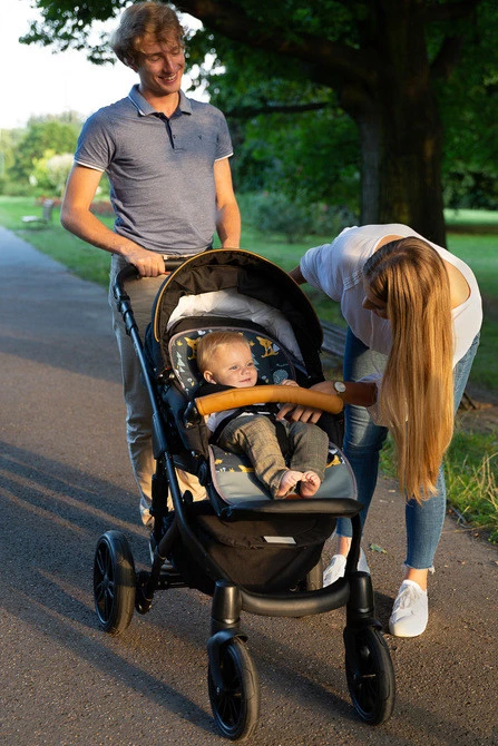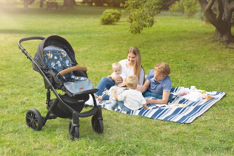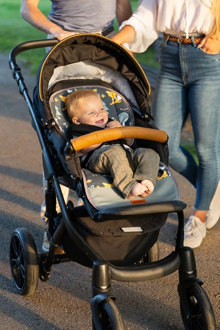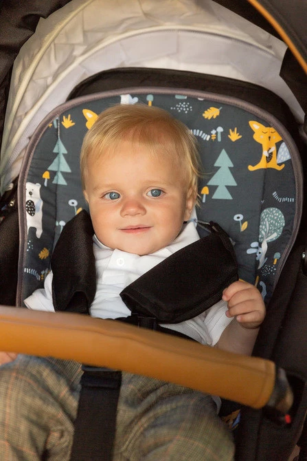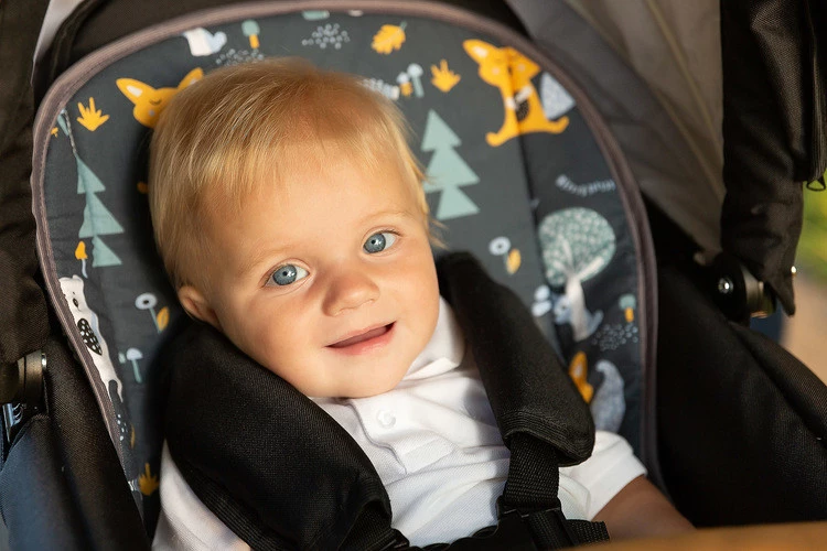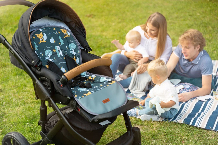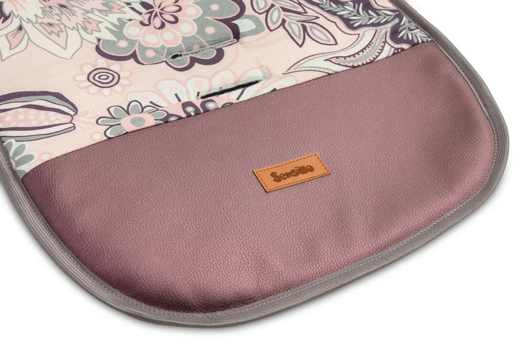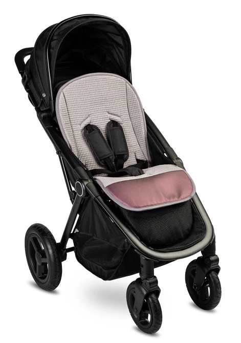 Dzięki uniwersalnej wkładce do wózka z wodoodpornym podnóżkiem, każdy może zmienić wygląd swojego wózka spacerowego. Dwustronna wkładka z jednej strony posiada gładką bawełnę z modnym wzorem, natomiast z drugiej strony znajduje się jednobarwna bawełna o strukturze wafla. Po obu stronach na dole dodaliśmy łatwą w czyszczeniu kolorową ekoskórę. Wkładka pomaga utrzymać wnętrze wózka w czystości oraz podnosi komfort podróżowania. Dodatkowo posiada otwory na pasy bezpieczeństwa oraz wstążkę, do której przywiązać można poduszkę do kompletu.