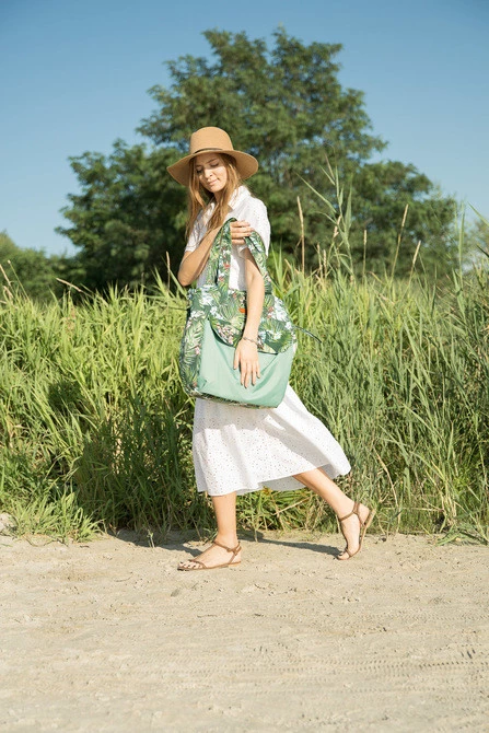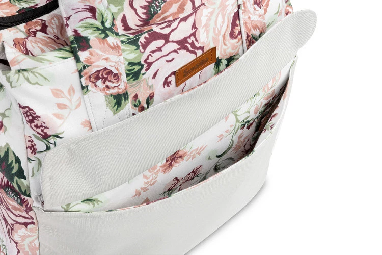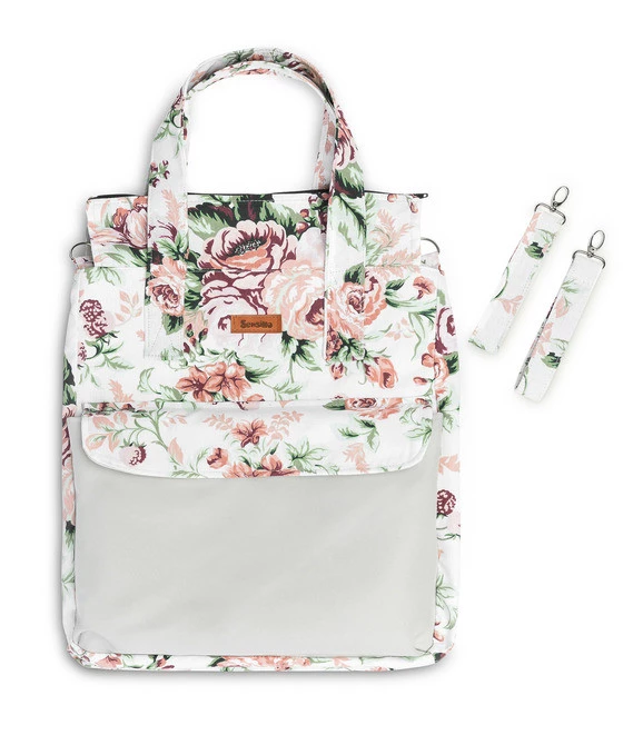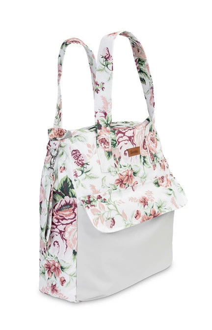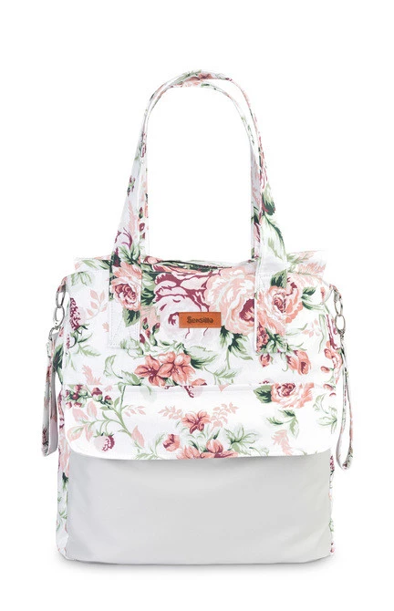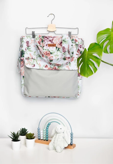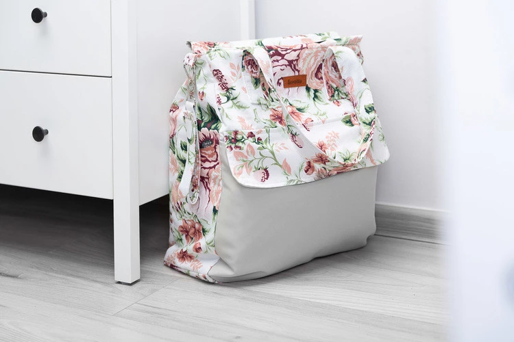 Duża pojemna torba dla mamy, świetnie nadająca się na spacer, zakupy czy do szpitala. Dzięki swojemu dużemu rozmiarowi, pomieści wszystkie niezbędne akcesoria. Przednia kieszeń zamykana na dyskretny magnes pomieści wszystkie rzeczy, które powinny być pod ręką. Wnętrze torby wykończone jest poliestrową podszewką. Nieodzownym elementem torby są wytrzymałe, kolorowe uchwyty, dzięki którym można ją zawiesić na ramie wózka.