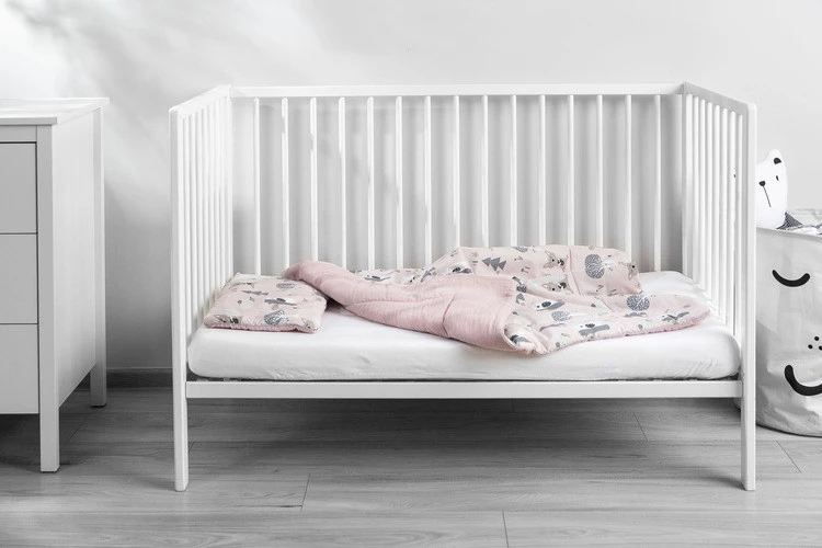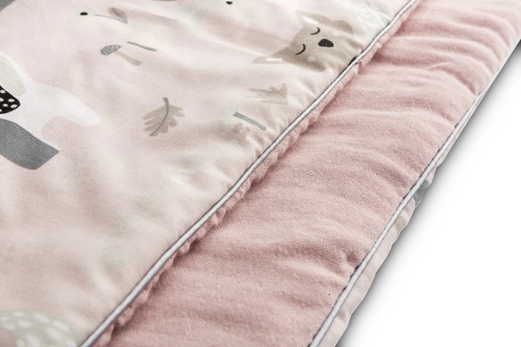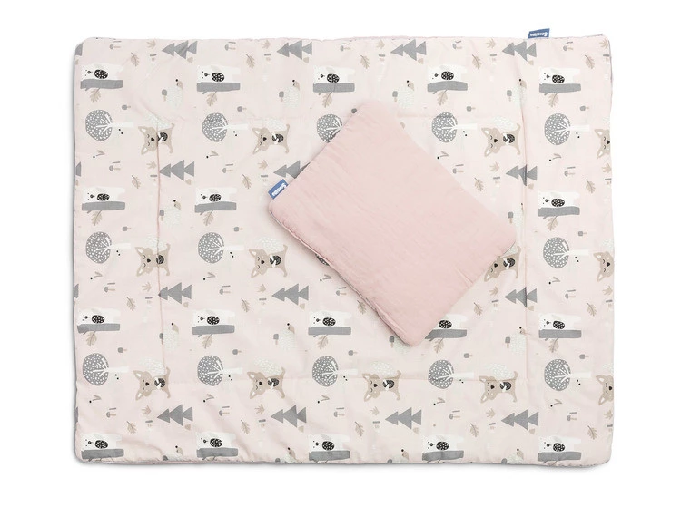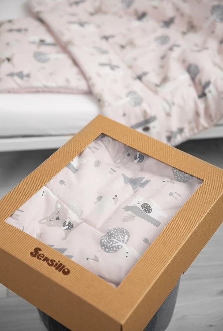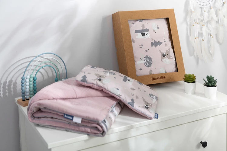 Komplet do łóżeczka to połączenie wysokiej jakości muślinu z jednej strony, z drukowaną bawełną z drugiej. Składa się z dwustronnej płaskiej poduszki oraz kołderki z wypełnieniem. Połączenie naturalnych i przewiewnych tkanin idealnie sprawdzi się w łóżeczku, gondoli czy kołysce.  Wypełniony jest antyalergiczną silikonową włókniną. Komplet zapakowany jest w gustowne kartonowe opakowanie, w sam raz na prezent.