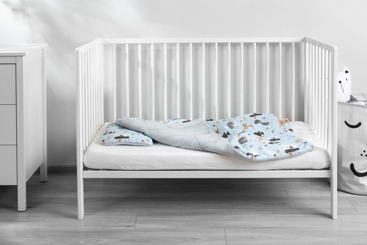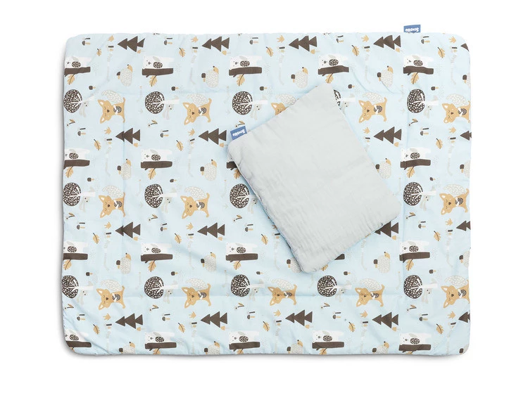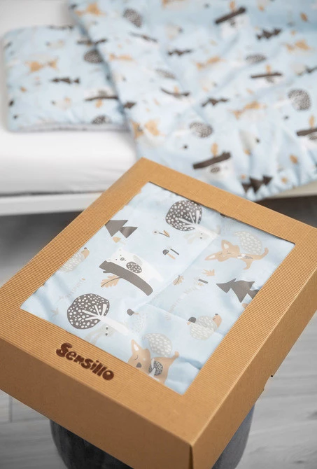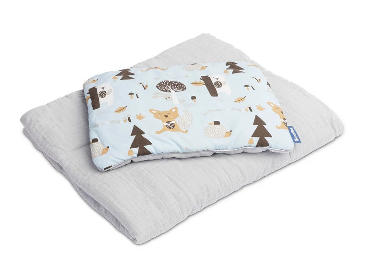 Komplet do łóżeczka to połączenie wysokiej jakości muślinu z jednej strony, z drukowaną bawełną z drugiej. Składa się z dwustronnej płaskiej poduszki oraz kołderki z wypełnieniem. Połączenie naturalnych i przewiewnych tkanin idealnie sprawdzi się w łóżeczku, gondoli czy kołysce. Wypełniony jest antyalergiczną silikonową włókniną. Komplet zapakowany jest w gustowne kartonowe opakowanie, w sam raz na prezent.