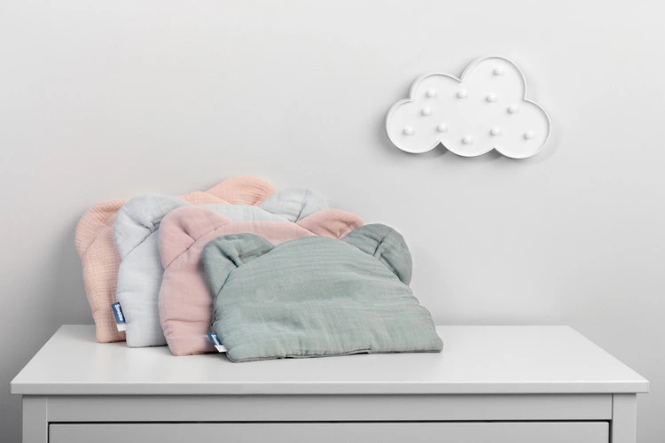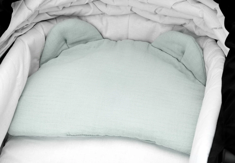 z delikatnej muśliny, a wypełnienie stanowi antyalergiczna włóknina silikonowa. Materiały te nie podrażnią delikatnej skóry dziecka. Poduszka jest płaska, idealna nawet dla noworodków.