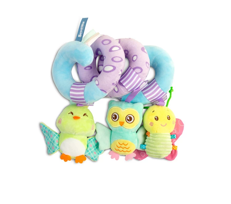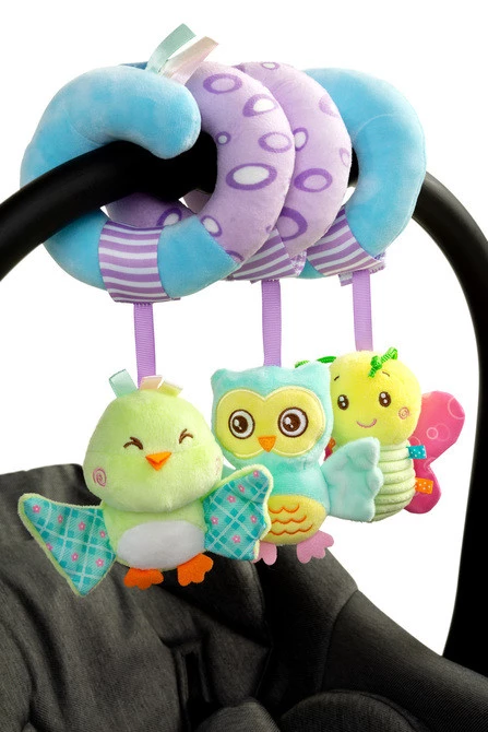 • Spiralka posiada dwa zwierzątka z piszczkiem i jedno z grzechotką-dzwoneczkiem. Dodatkowo każde posiada szeleszczące skrzydełka