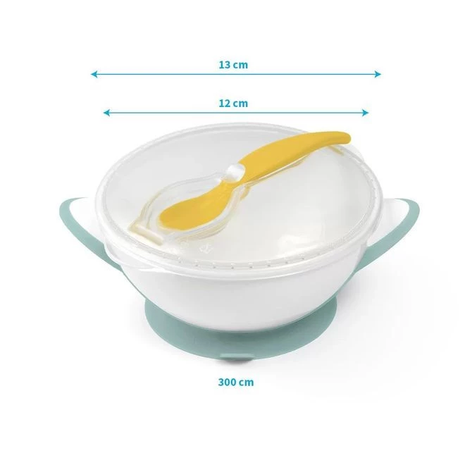 Miseczka posiada pokrywkę, którą można szczelnie ją zamknąć. Dodatkowo w pokrywce został specjalnie zaprojektowany schowek, który uchroni łyżeczkę przed zagubieniem i zabrudzeniem.