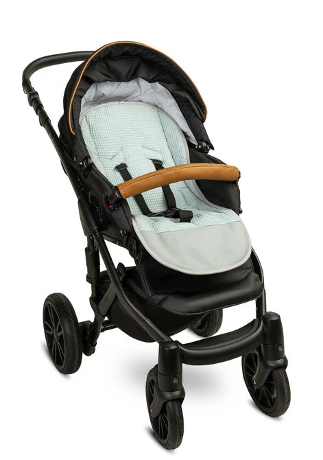 Dzięki uniwersalnej wkładce do wózka z wodoodpornym podnóżkiem, każdy może zmienić wygląd swojego wózka spacerowego. Dwustronna wkładka z jednej strony posiada gładką bawełnę z modnym wzorem, natomiast z drugiej strony znajduje się jednobarwna bawełna o strukturze wafla. Po obu stronach na dole dodaliśmy łatwą w czyszczeniu kolorową ekoskórę. Wkładka pomaga utrzymać wnętrze wózka w czystości oraz podnosi komfort podróżowania. Dodatkowo posiada otwory na pasy bezpieczeństwa oraz wstążkę, do której przywiązać można poduszkę do kompletu.