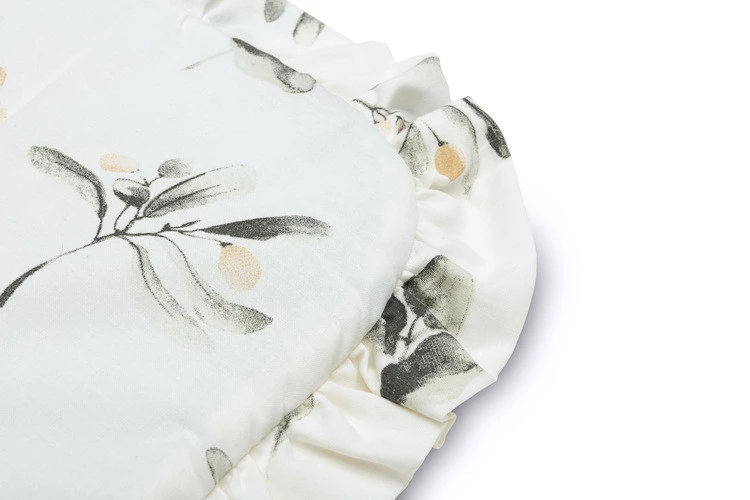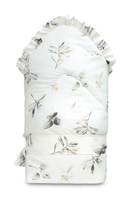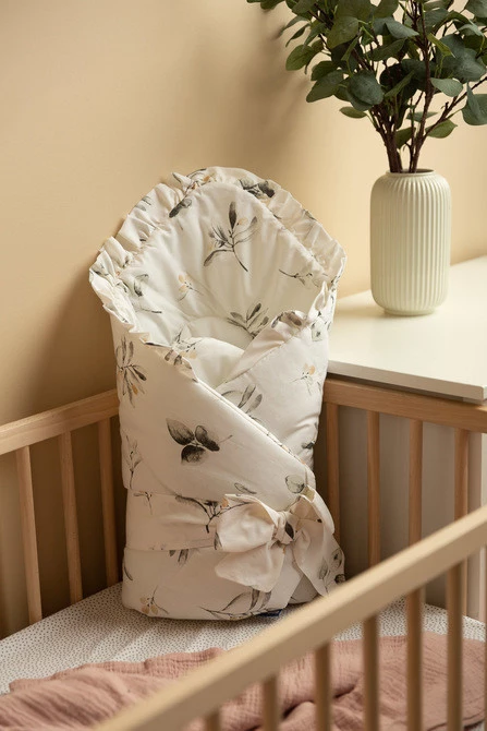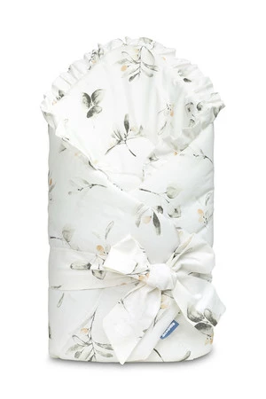 Dwustronny rożek niemowlęcy z falbanką został stworzony z myślą o noworodkach i niemowlętach. Wiązane zapięcie z szeroką bawełnianą tasiemką umożliwia wygodne trzymanie dziecka podczas karmienia i usypiania. Po rozłożeniu, rożek może być z powodzeniem stosowany jako kołderka do łóżeczka czy wózka dziecięcego. Może także służyć jako mata do zabawy. Wykonany został z bawełny 100%. Wypełnienie rożka to włóknina puszysta silikonowa. Wykończenie stanowi gustowna falbanka.