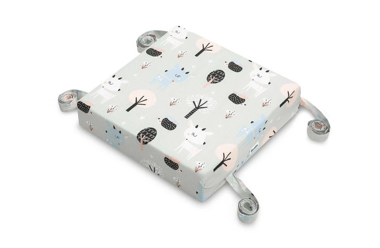 Siedzisko na krzesło dla dzieci to wygodna podwyższająca ‘‘poduszka”, która pomaga sięgnąć stołu. Jest to idealny wybór, gdy dziecko jest zbyt duże na krzesełko do karmienia a zbyt małe na standardowe krzesło stołowe. W jej wnętrzu znajduje się gruba (8 cm), odporna na zniekształcenia i zapewniająca wysoki komfort pianka poliuretanowa. Poszycie wykonane jest z 100% bawełny i posiada zamek błyskawiczny, który ułatwia jej ściągnięcie i wypranie. Uniwersalny rozmiar (32 cm x 32 cm x 8 cm) sprawia, że pasuje do standardowych krzeseł. Jest lekka i łatwo ją zabrać ze sobą wszędzie. Wszyte paski umożliwiają jej stabilne i bezpieczne zamocowanie do krzesła.