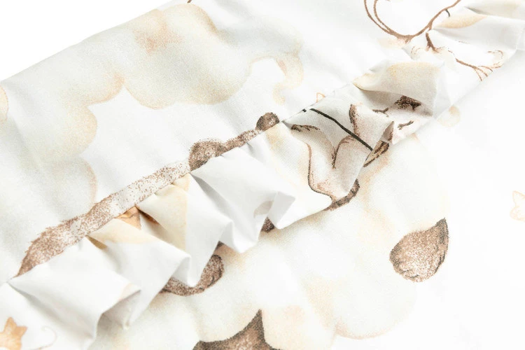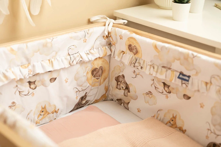 Ochraniacz do łóżeczka pasuje do każdego standardowego łóżeczka dziecięcego. Wyróżnia się pięknymi materiałami i wszytą falbanką, które sprawią, że pokoik maluszka zyska wyjątkowy urok. Ochraniacz wykonany jest z miękkiej bawełny z nadrukiem. Wypełnienie z owaty ochroni dziecko przed urazami podczas poruszania się po łóżeczku. Utrzymanie ochraniacza we właściwej pozycji zapewnia gęste wszycie tasiemek służących do przywiązania go do szczebelków łóżeczka. Zaprojektowany został do łóżeczka o wymiarach 120×60 cm. Ochraniacz będzie doskonałym dodatkiem do wyprawki dla niemowlaka.