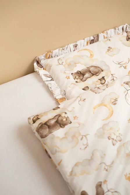 Pościel 2-elementowa z falbanką została uszyta z miłej w dotyku i trwałej bawełny. Połączenia kolorystyczne będą idealnie pasowały do każdego dziecięcego pokoiku. Komplet zawiera poszewkę na kołderkę o wym. 100x135cm i poszewkę na poduszkę 40x60cm. Poszewka na kołdrę zapinana jest na zamek, natomiast poduszka na zakładkę.