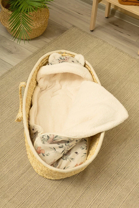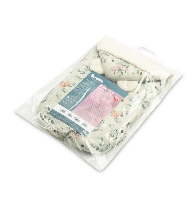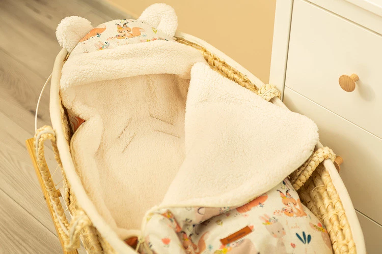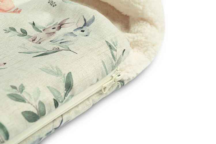 Śpiworek do fotelika oraz wózka głębokiego wykonany został z myślą o najmniejszych dzieciach. Doszyte uszka w kapturku oraz delikatny wzór stanowią o jego uroczym charakterze. Warstwa wierzchnia to wysokiej jakości tkanina wodoodporna z pięknym wzorem. W środku znajduje się puszysta włóknina silikonowa chroniąca przed chłodem. Warstwę wewnętrzną stanowi bardzo delikatny i przyjemny plusz, który daje dodatkowe ciepło. Posiada dwa suwaki, które umożliwiają odpięcie śpiworka z lewej lub prawej strony, a także całkowicie odpięcie przodu. Śpiworek posiada otwory na 3 punktowe pasy bezpieczeństwa. Z powodzeniem można go stosować w nosidełkach, gondolach a nawet sankach. Dedykowany jest dzieciom w wieku od 0-18 miesięcy.