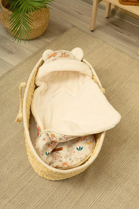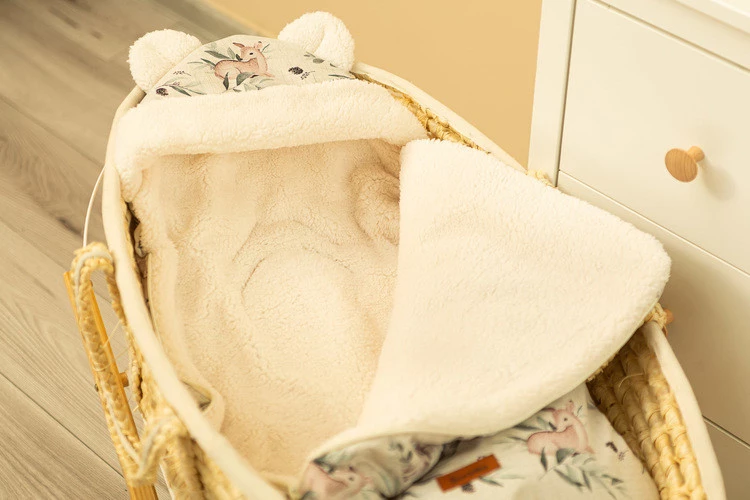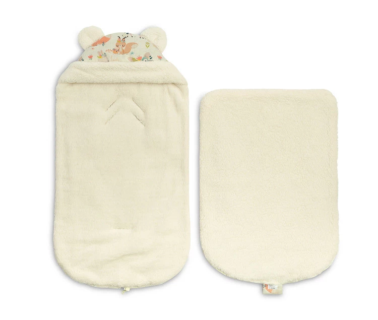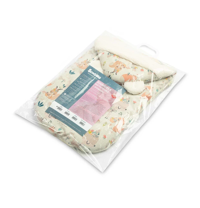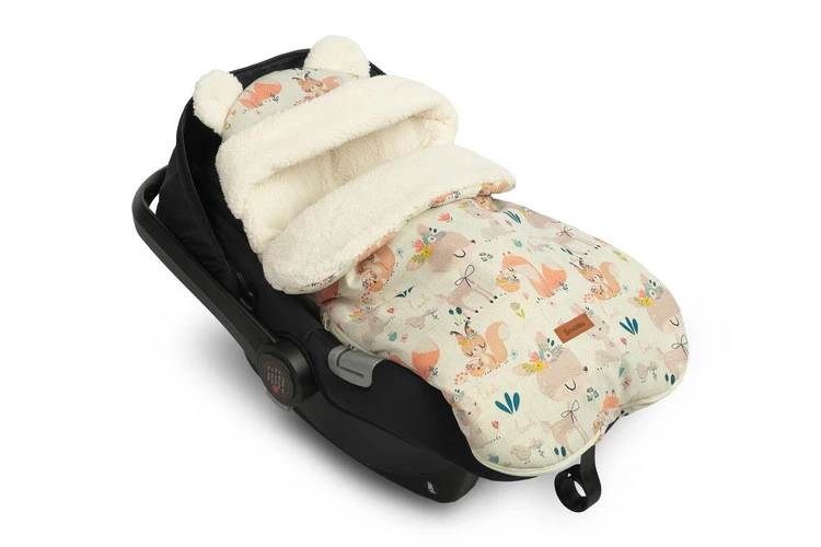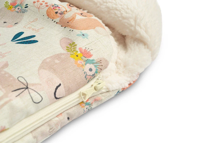 Śpiworek do fotelika oraz wózka głębokiego wykonany został z myślą o najmniejszych dzieciach. Doszyte uszka w kapturku oraz delikatny wzór stanowią o jego uroczym charakterze. Warstwa wierzchnia to wysokiej jakości tkanina wodoodporna z pięknym wzorem. W środku znajduje się puszysta włóknina silikonowa chroniąca przed chłodem. Warstwę wewnętrzną stanowi bardzo delikatny i przyjemny plusz, który daje dodatkowe ciepło. Posiada dwa suwaki, które umożliwiają odpięcie śpiworka z lewej lub prawej strony, a także całkowicie odpięcie przodu. Śpiworek posiada otwory na 3 punktowe pasy bezpieczeństwa. Z powodzeniem można go stosować w nosidełkach, gondolach a nawet sankach. Dedykowany jest dzieciom w wieku od 0-18 miesięcy.
