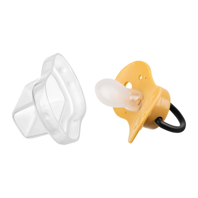 Smoczek uspokajający wykonany z najwyższej jakości, bezzapachowego i bezsmakowego silikonu. Wyposażony w gumkę o symetrycznym kształcie. Zapewnia swobodne oddychanie i połykanie śliny. Smoczek dobrze odpowietrza się, dzięki specjalnym otworom wentylacyjnym na tarczce.