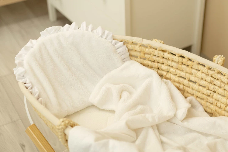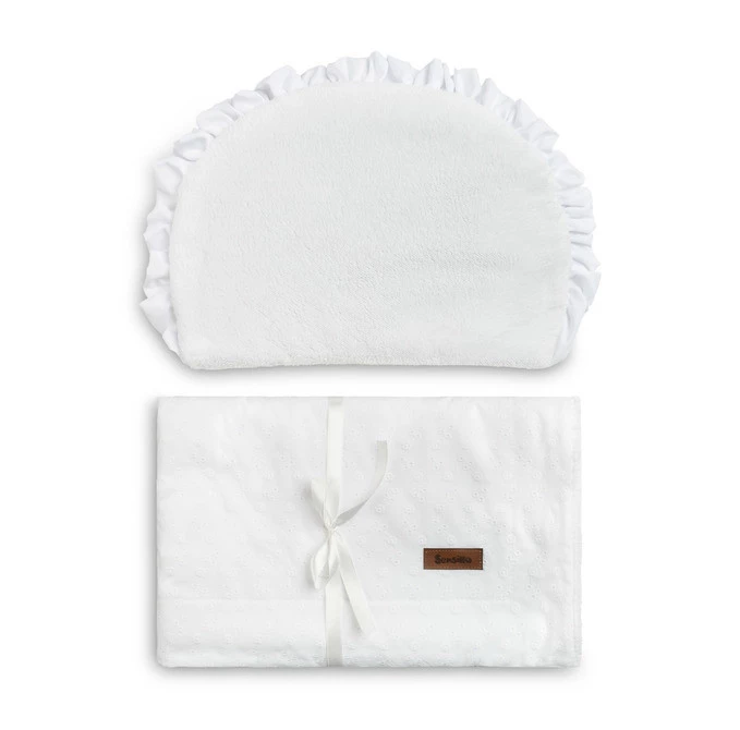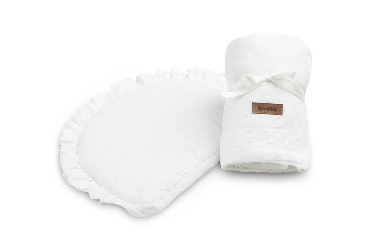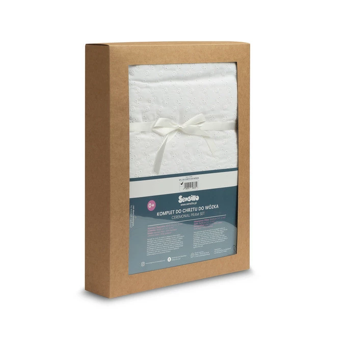 Komplet do chrztu do wózka to elegancki biały zestaw składający się z poduszki oraz lekkiego kocyka. Jedna strona kompletu została wykonana z bawełny z uroczym i delikatnym haftem angielskim. Druga to mięciutki plusz, który przyjemnie otuli niemowlę. Poduszka wypełniona jest lekką, antyalergiczną włókniną silikonową, która nie przemieszcza się w trakcie użytkowania. Kocyk nie posiada dodatkowego wypełnienia, jest lekki a warstwa pluszowa zapewnia wystarczającą ochronę przed zimnem.
