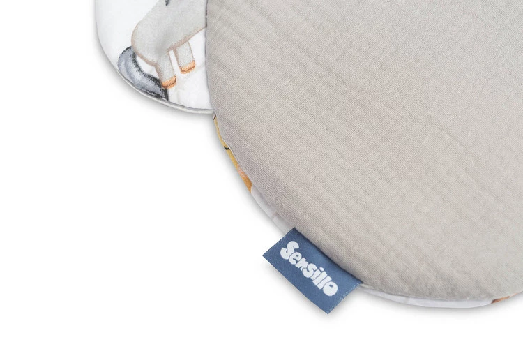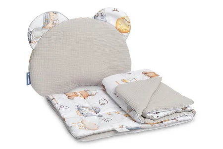 W skład kompletu wchodzi poduszka i kocyk wykonane z przyjemnego w dotyku muślinu i bawełny. Komplet idealnie sprawdza się w wózku, łóżeczku czy jako miękka mata dla Maluszka. Sama poduszka może służyć jako przytulanka. Zestaw został wykonany z dwóch materiałów – strona wewnętrzna to 100% bawełna, a warstwa zewnętrzna to miękki muślin.