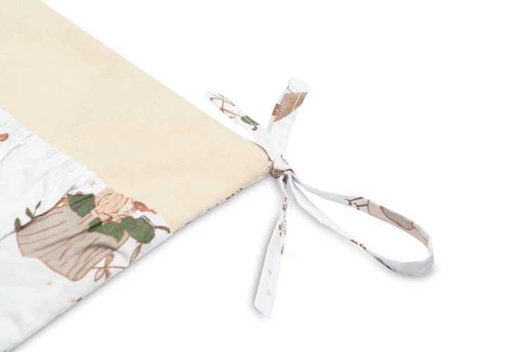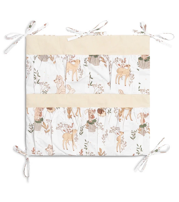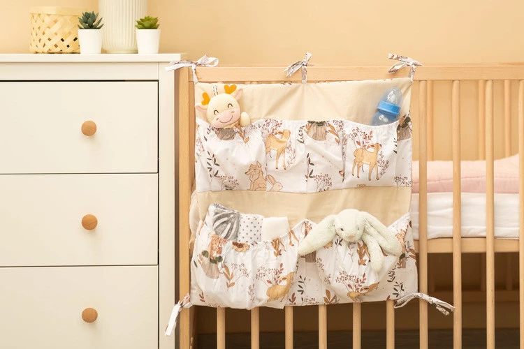 Organizer na łóżeczko to nie tylko praktyczny produkt, ale także ozdoba pokoiku dziecięcego. Posiada w sumie 5 kieszeni wzmocnionych gumką, które pomieszczą wszystkie niezbędne akcesoria. Organizer można łatwo zamontować na ramie łóżeczka przy pomocy wszytych tasiemek. Usztywniony został dodatkowo warstwą włókniny silikonowej. Z zewnątrz obszyty jest 100% bawełną. Organizer można skompletować z innymi produktami naszej oferty.