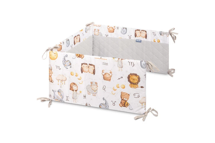 Ochraniacz do łóżeczka pasuje do każdego standardowego łóżeczka dziecięcego. Ochraniacz wykonany jest z miękkiej bawełny z nadrukiem i przyjemnego w dotyku muślinu. Poliestrowe wypełnienie ochroni dziecko przed urazami podczas poruszania się po łóżeczku. Utrzymanie ochraniacza we właściwej pozycji zapewniają tasiemki służące do przywiązania go do szczebelków łóżeczka. Zaprojektowany został do łóżeczka o wymiarach 120x60 cm. Ochraniacz będzie doskonałym dodatkiem do wyprawki dla niemowlaka