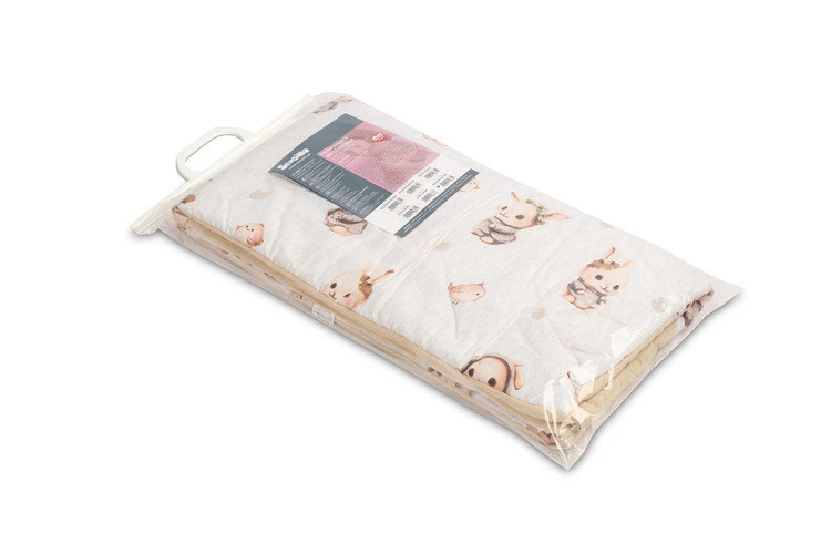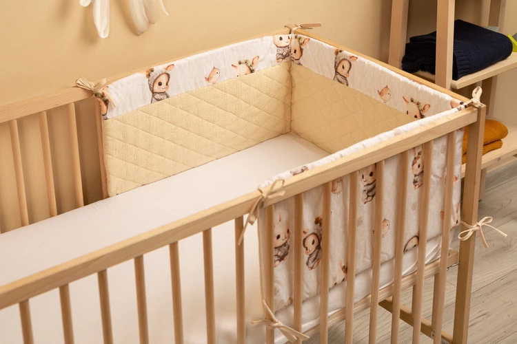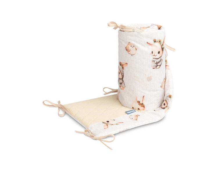 Ochraniacz do łóżeczka pasuje do każdego standardowego łóżeczka dziecięcego. Ochraniacz wykonany jest z miękkiej bawełny z nadrukiem i przyjemnego w dotyku muślinu. Poliestrowe wypełnienie ochroni dziecko przed urazami podczas poruszania się po łóżeczku. Utrzymanie ochraniacza we właściwej pozycji zapewniają tasiemki służące do przywiązania go do szczebelków łóżeczka. Zaprojektowany został do łóżeczka o wymiarach 120x60 cm. Ochraniacz będzie doskonałym dodatkiem do wyprawki dla niemowlaka