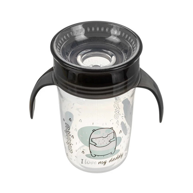 Kubek 360 Stopni marki „akuku” sprawdzi się zarówno w domu, jak i w podróży czy na spacerze. Wykonany z bezpiecznych surowców, lekki i wytrzymały. Idealnie nadaje się do nauki picia. Łatwy w utrzymaniu czystości. Transparentny kolor umożliwia łatwe kontrolowanie zawartości. Specjalny ergonomiczny kształt zapewnia dużą wygodę w użytkowaniu. Kubek wyposażony jest w wygodne, szerokie uchwyty, które ułatwiają trzymanie go w malutkich rączkach.