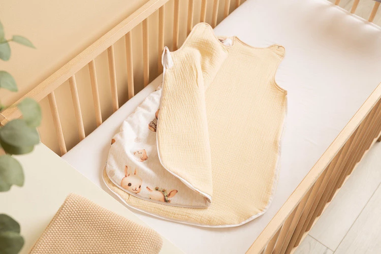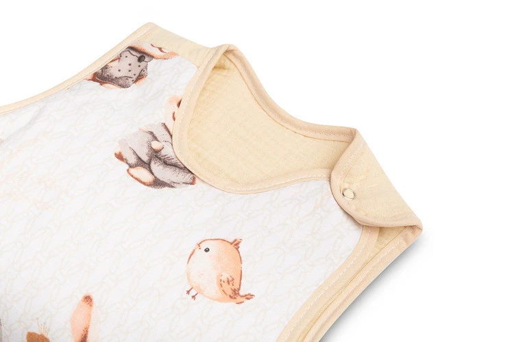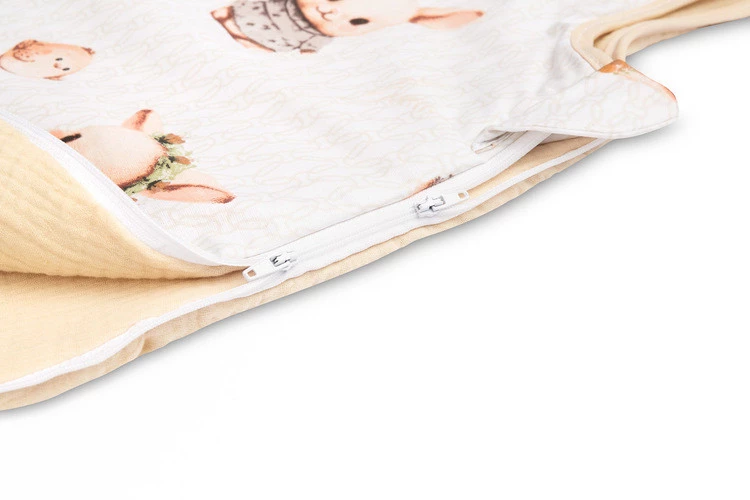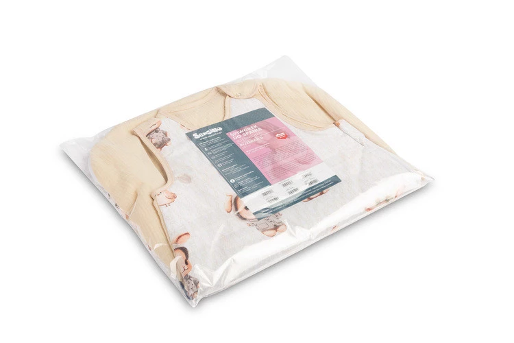 Śpiworek do spania będzie służył dzieciom już od pierwszych dni życia (0-9 miesięcy) zapewniając im ciepło i bezpieczeństwo. Uszyty jest z miękkiej bawełny wypełnionej otuliną. Wnętrze i tył śpiworka są wykonane z bawełny muślinowej. Produkt nie zawiera twardych elementów, które mogłyby podrażnić skórę dziecka. Wyposażony jest w dwustronny zamek błyskawiczny, poprowadzony wokół śpiworka, pozwalający na zmianę pieluchy bez wyciągania dziecka ze śpiworka.