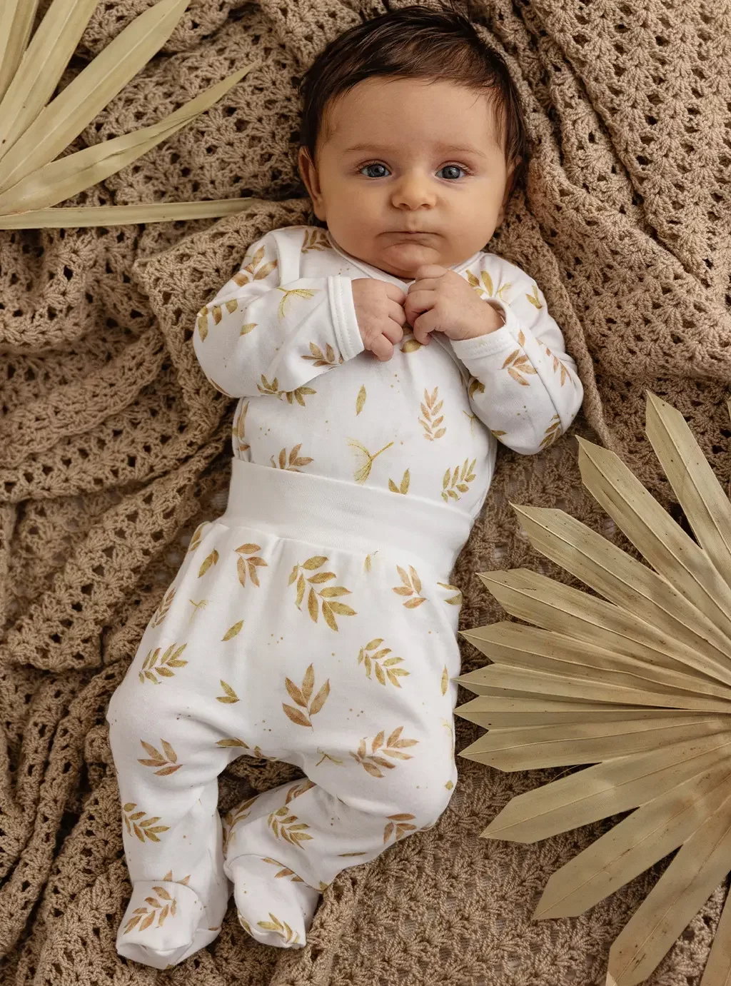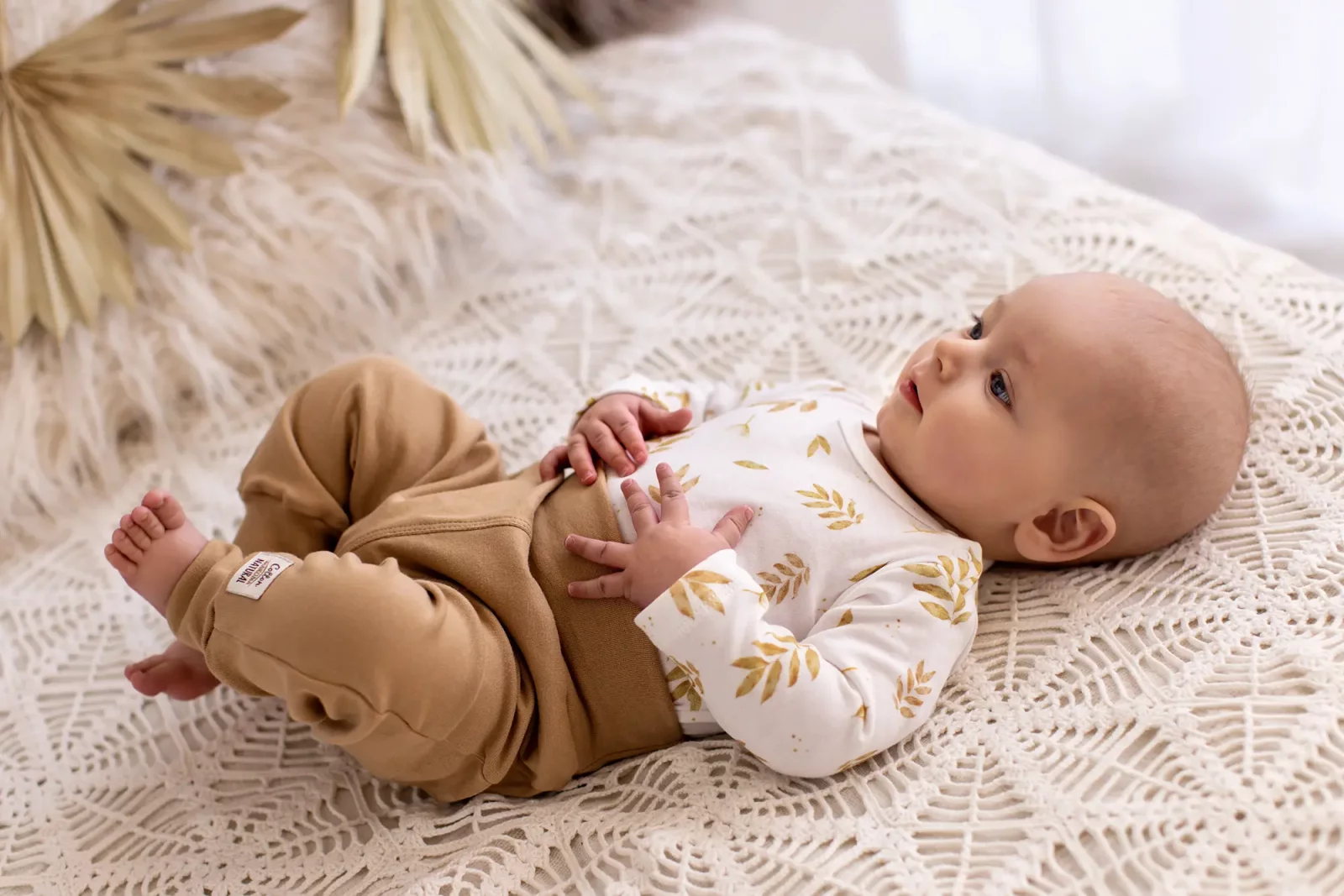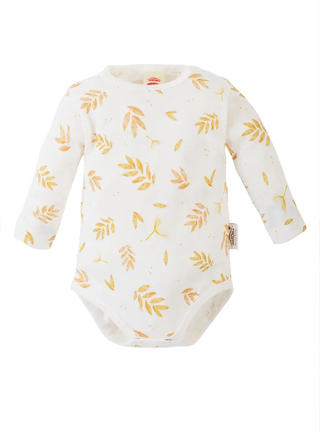 Body niemowlęce w w delikatne złote liście dostępne jest również z krótkim rękawem, możesz też dobrać do niego wygodny klasyczny pajacyk niemowlęcy i cieszyć się wyjątkową jakością tych produktów.