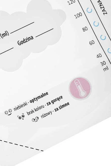 - Wskaźnik ciepła: Innowacyjny wskaźnik temperatury na woreczku informuje, gdy mleko osiąga optymalną temperaturę do podania dziecku.
