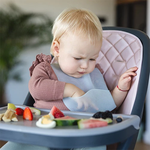 Kieszonka na okruszki sprawia, że większość resztek jedzenia nie trafia na podłogę ani ubranko.
