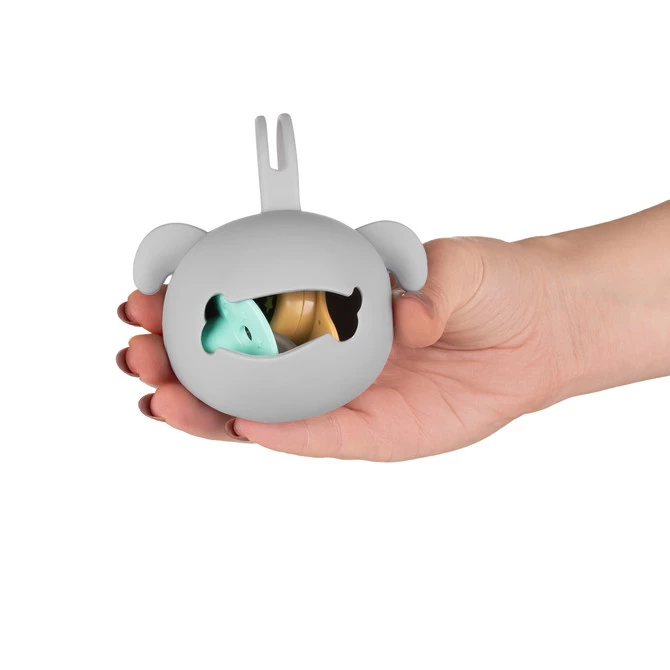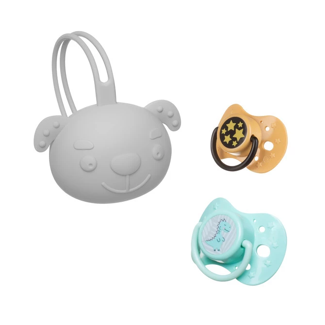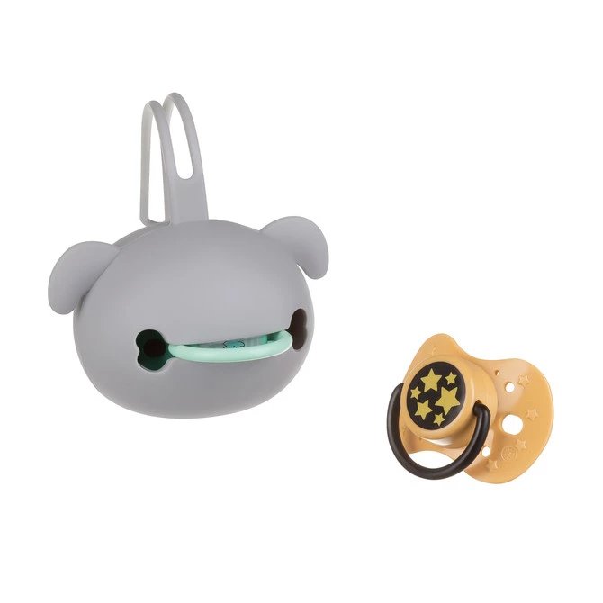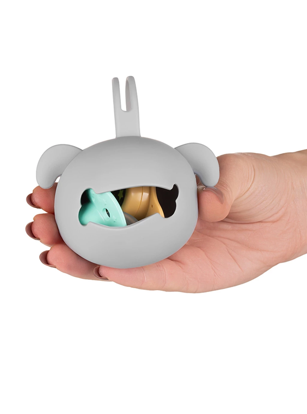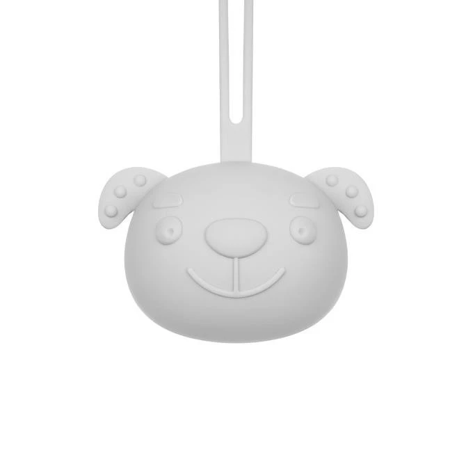 Praktyczny pojemnik na smoczek jest bardzo przydatny w czasie podróży lub spacerów. Chroni smoczek przed zabrudzeniem i uszkodzeniem. Bardzo łatwy w użyciu i prosty w zamocowaniu do wózka, fotelika, torby lub poręczy łóżeczka. Pomieści nawet 2 smoczki. Neutralna i przyjemna kolorystyka pasuje do każdego wózka i torby. Kształt pojemnika przypomina głowę pieska.