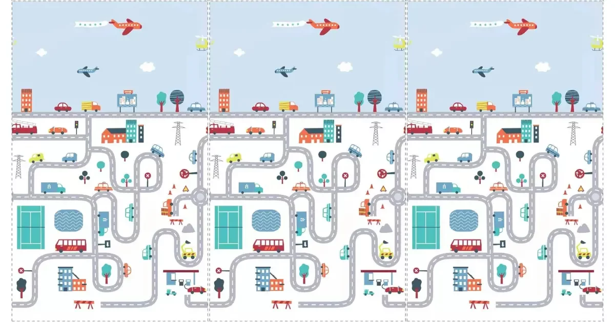 Jeżeli Twój maluch uwielbia bawić się autkami- wybierz wzór MIASTO. Są na nim ulice i domy, które ubarwią zabawę.