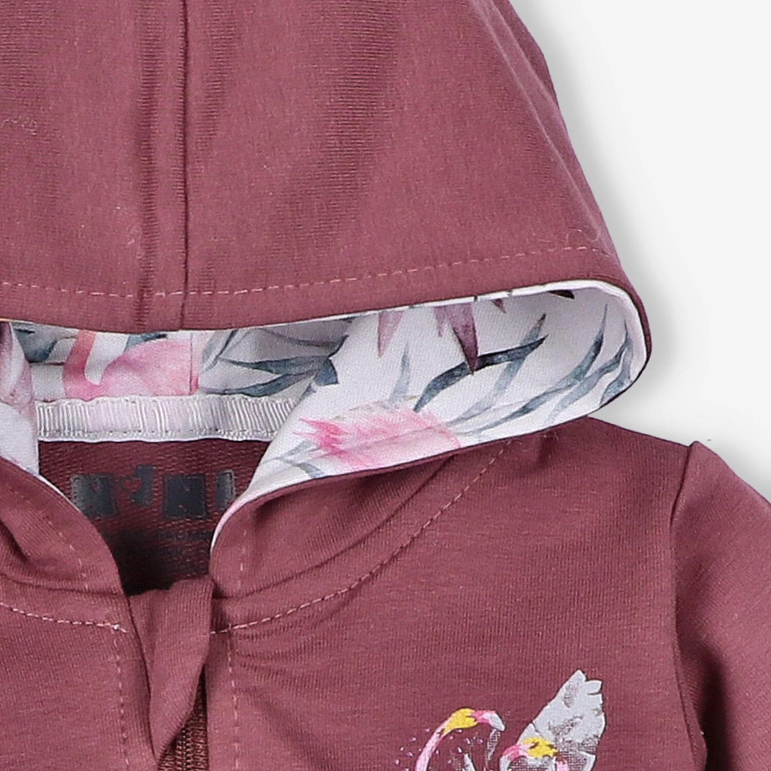Materiał jest bezpieczny dla delikatnej skóry, wolny od chemii i idealny dla dzieci z alergiami oraz skłonnościami do podrażnień. Bluza jest jednowarstwowa, zapinana na całej długości na zamek błyskawiczny z ochroną podbródka, która zapobiega przypadkowemu przycięciu szyi. Na przodzie bluzy znajduje się uroczy nadruk różowego flaminga, wykonany bezpieczną, miękką techniką.