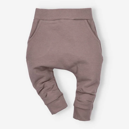 Dzięki luźnemu krojowi ubranko nie ogranicza ruchów dziecka, a miękka gumka w pasie i elastyczne wykończenia zapewniają dobre dopasowanie i wygodę przez cały dzień. Praktyczne boczne kieszenie dodają funkcjonalności i sprawiają, że spodnie świetnie sprawdzą się zarówno w domu, jak i podczas spacerów.
