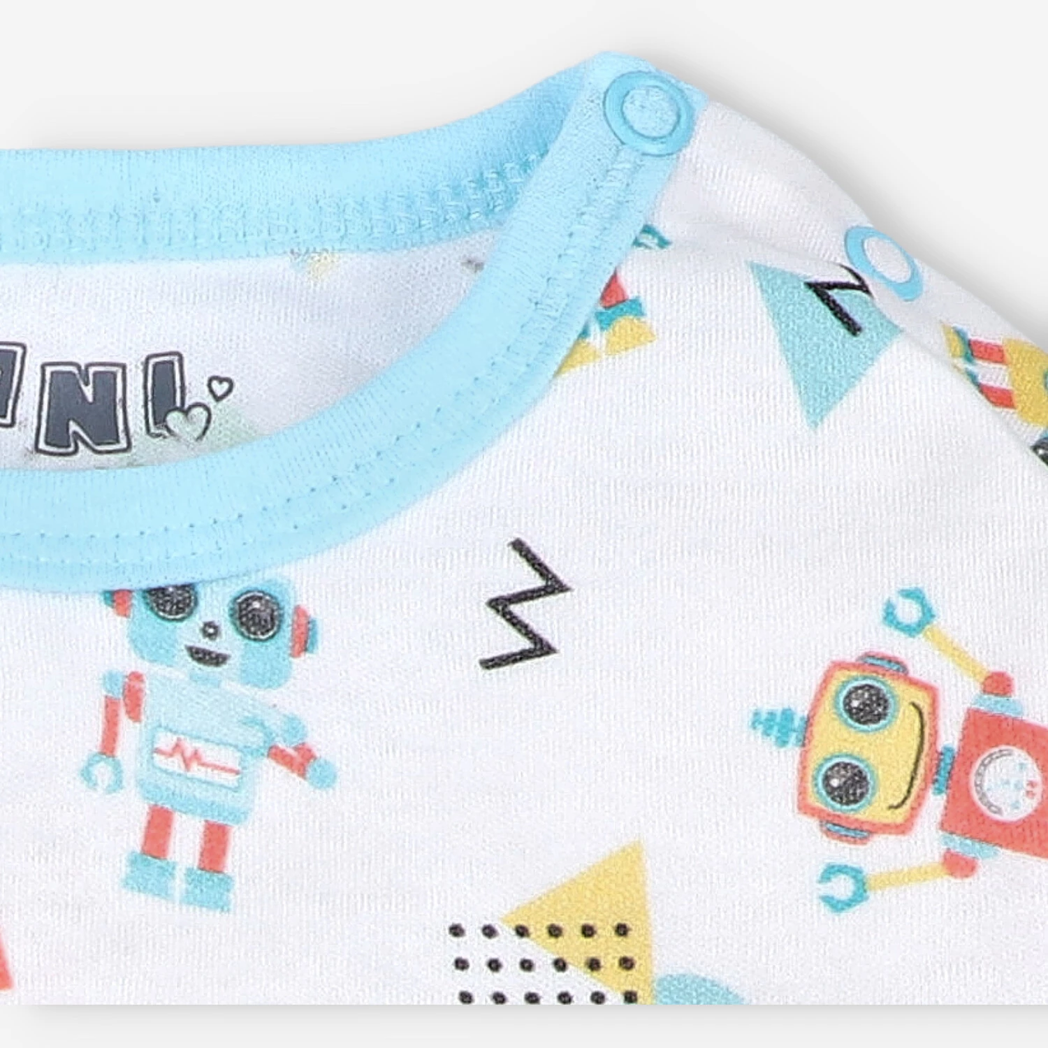 Na przodzie znajduje się uroczy nadruk z wesołymi robocikami, wykonany metodą nietoksycznych farb wodnych, co sprawia, że jest w pełni bezpieczny dla niemowląt. Rękawki zakończone są miękkim ściągaczem w błękitnym kolorze, który dodaje ubranku uroku i zapewnia wygodne dopasowanie.