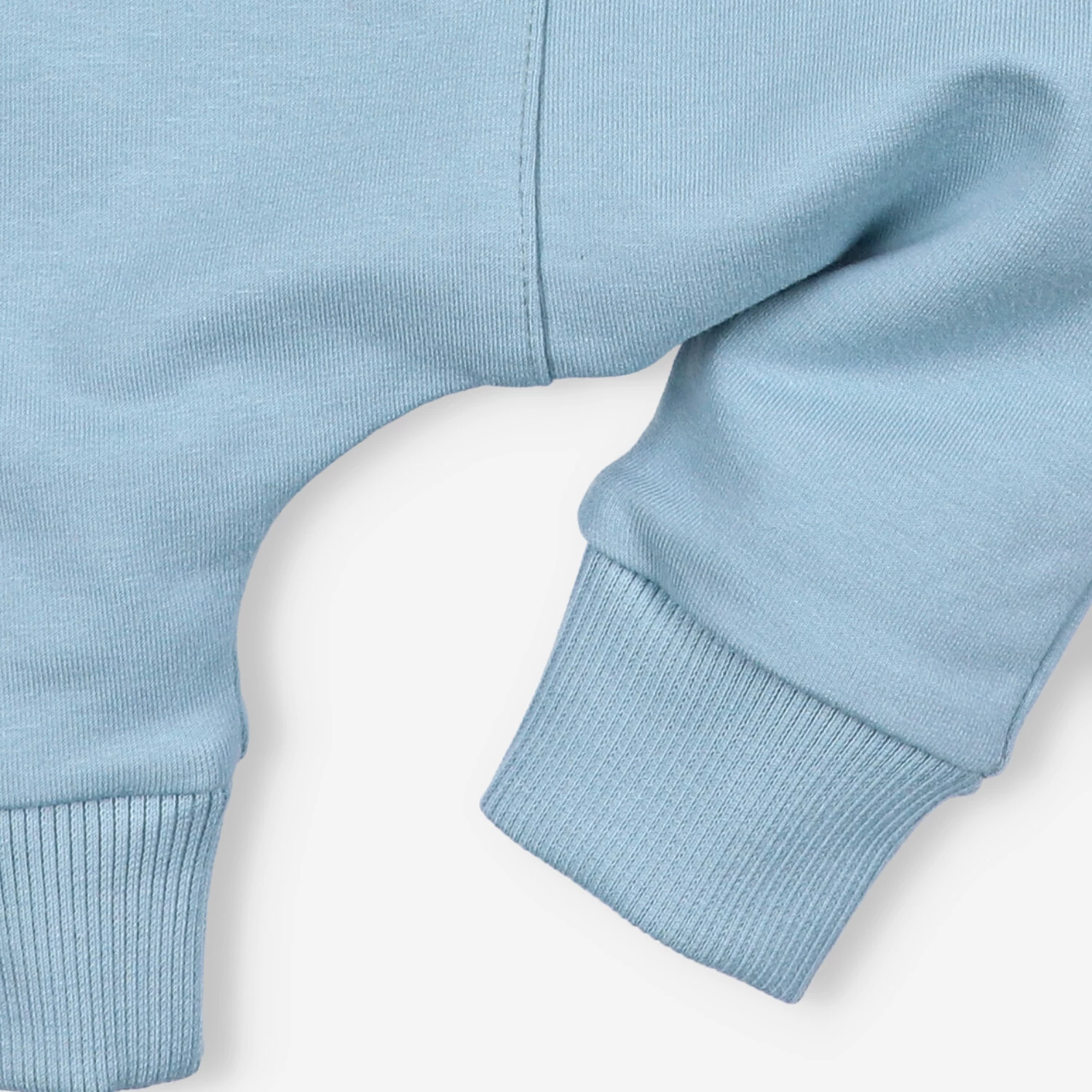 Spodnie mają luźny, swobodny fason, który nie krępuje ruchów malucha. Miękka gumka w pasie, elastyczne szwy i praktyczne kieszenie zapewniają komfort użytkowania na co dzień. Dodatkowe detale, takie jak ozdobna naszywka, imitacja rozporka i dekoracyjne guziczki, nadają im modnego wyglądu.